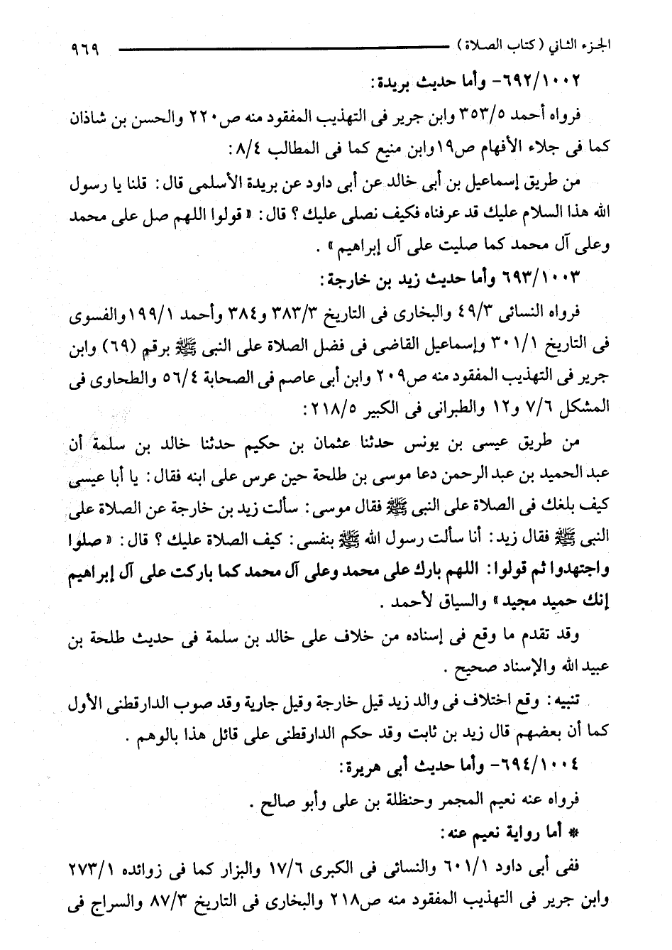 من طريق عيسى بن يونس حدثنا عثمان بن حكيم حدثنا خالد بن سلمة أن عبد الحميد بن عبد الرحمن دعا موسى بن طلحة حين عرس على ابنه فقال: يا أبا عيسى كيف بلغك في الصلاة على النبي - صلى الله عليه وسلم - فقال موسى: سألت زيد بن خارجة عن الصلاة على النبي - صلى الله عليه وسلم - فقال زيد: أنا سألت رسول الله - صلى الله عليه وسلم - بنفسى: كيف الصلاة عليك؟ قال: "صلوا واجتهدوا ثم قولوا: اللهم بارك على محمد وعلى آل محمد كما باركت على آل إبراهيم إنك حميد مجيد" والسياق لأحمد.