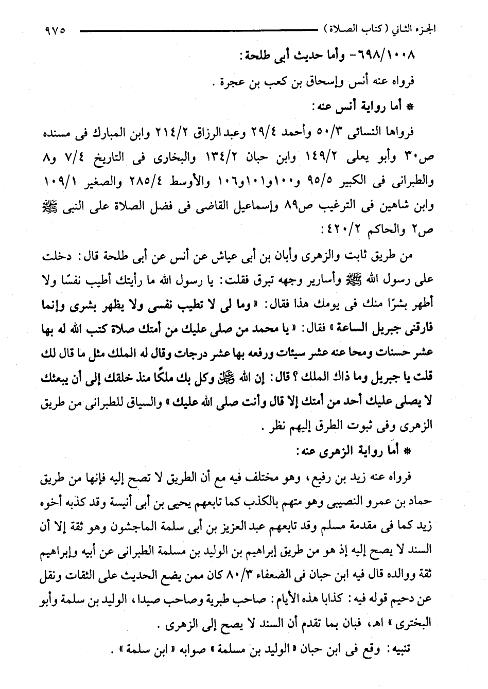 من طريق ثابت والزهرى وأبان بن أبى عياش عن أنس عن أبى طلحة قال: دخلت على رسول الله - صلى الله عليه وسلم - وأسارير وجهه تبرق فقلت: يا رسول الله ما رأيتك أطيب نفسًا ولا أطهر بشرًا منك في يومك هذا فقال: "وما لى لا تطيب نفسى ولا يظهر بشرى وإنما فارقنى جبريل الساعة" فقال: "يا محمد من صلى عليك من أمتك صلاة كتب الله له بها عشر حسنات ومحا عنه عشر سيئات ورفعه بها عشر درجات وقال له الملك مثل ما قال لك قلت يا جبريل وما ذاك الملك؟ قال: إن الله -عز وجل- وكل بك ملكًا مسند خلقك إلى أن يبعثك لا يصلى عليك أحد من أمتك إلا قال وأنت صلى الله عليك" والسياق للطبراني من طريق الزهري وفى ثبوت الطرق إليهم نظر.