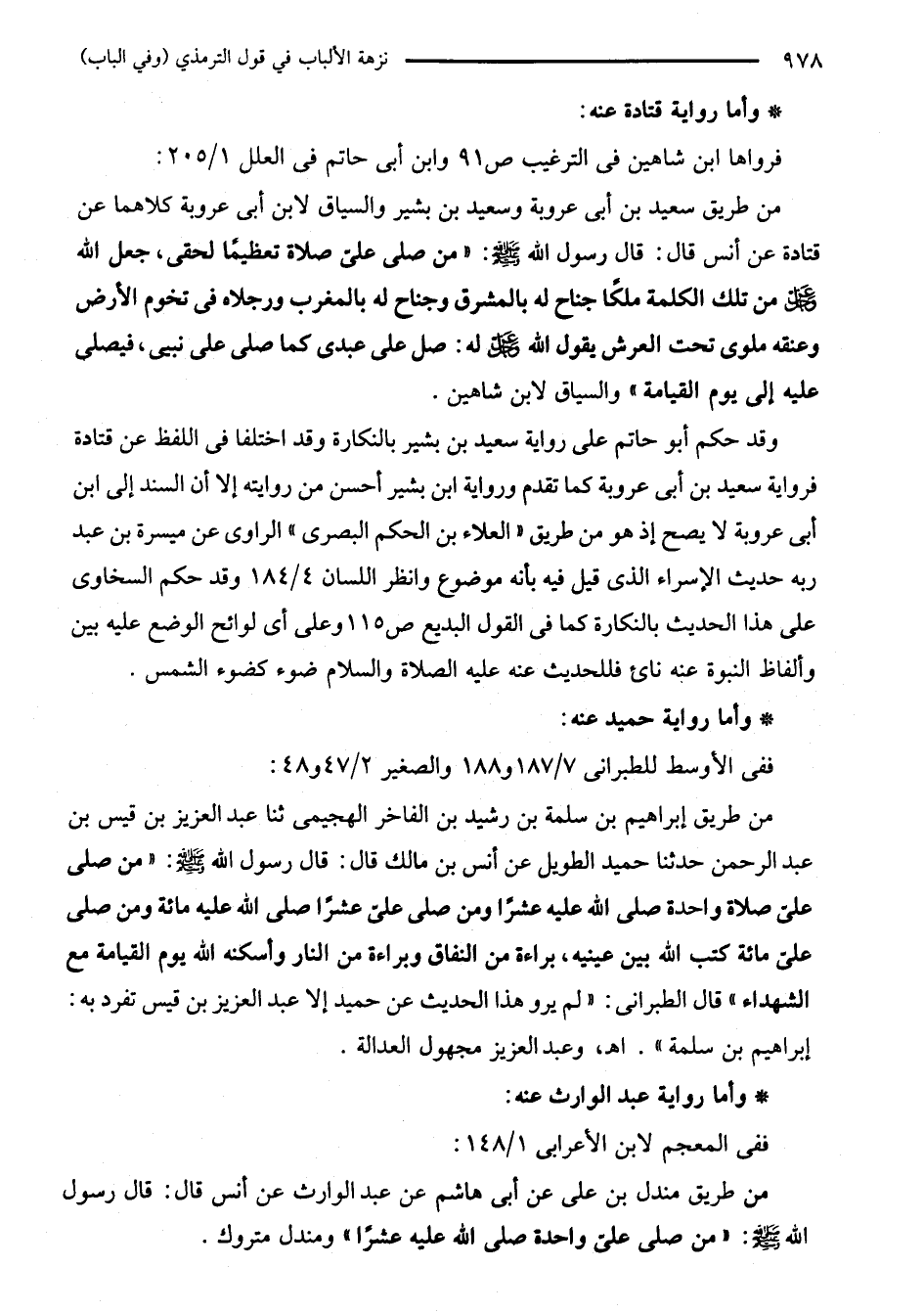 وقد حكم أبو حاتم على رواية سعيد بن بشير بالنكارة وقد اختلفا في اللفظ عن قتادة فرواية سعيد بن أبى عروبة كما تقدم ورواية بن بشير أحسن من روايته إلا أن السند إلى ابن أبى عروبة لا يصح إذ هو من طريق "العلاء بن الحكم البصرى" الراوى عن ميسرة بن عبد ربه حديث الإسراء الذي قيل فيه بأنه موضوع وانظر اللسان 4/ 184 وقد حكم السخاوى على هذا الحديث بالنكارة كما في القول البديع ص 115 وعلى أي لوائح الوضع عليه بين وألفاظ النبوة عنه نائ فللحديث عنه عليه الصلاة والسلام ضوء كضوء الشمس.