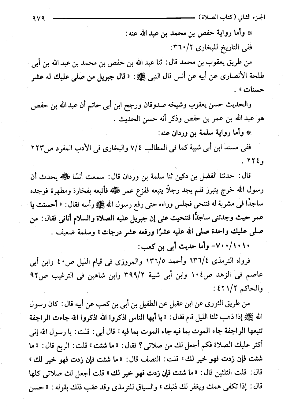 من طريق الثورى عن ابن عقيل عن الطفيل بن أبى بن كعب عن أبيه قال: كان رسول الله - صلى الله عليه وسلم - إذا ذهب ثلثا الليل قام فقال: "يا أيها الناس اذكروا الله اذكروا الله جاءت الراجفة تتبعها الراجفة جاء الموت بما فيه جاء الموت بما فيه" قال أبى: قلت: يا رسول الله إنى أكثر عليك الصلاة فكم أجعل لك من صلاتى؟ فقال: "ما شئت" قلت: الربع قال: "ما شئت فإن زدت فهو خير لك" قلت: النصف قال: "ما شئث فإن زدت فهو خير لك" قال: قلت الثلثين قال: "ما شئت فإن زدت فهو خير لك" قلت أجعل لك صلاتى كلها قال: إذا تكفى همك ويغفر لك ذنبك" والسياق للترمذي وقد عقب ذلك بقوله: "حسن