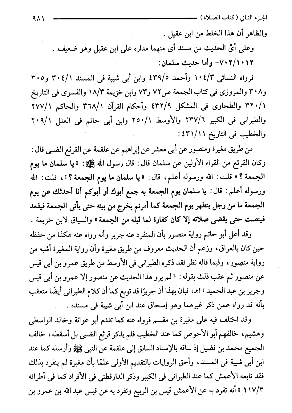 من طريق مغيرة ومنصور عن أبى معشر عن إبراهيم عن علقمة عن القرثع الضبى قال: وكان القرثع من القراء الأولين عن سلمان قال: قال رسول الله - صلى الله عليه وسلم -: "يا سلمان ما يوم الجمعة؟ " قلت: الله ورسوله أعلم، قال: "يا سلمان ما يوم الجمعة؟ "، قلت: الله ورسوله أعلم: قال: يا سلمان يوم الجمعة به جمع أبوك أو أبوكم أنا أحدثك عن يوم الجمعة ما من رجل يتطهر يوم الجمعة كما أمرتم يخرج من بينه حتى يأتى الجمعة فيقعد فينصت حتى يقضى صلاته إلا كان كفارة لما قبله من الجمعة" والسياق لابن خزيمة.