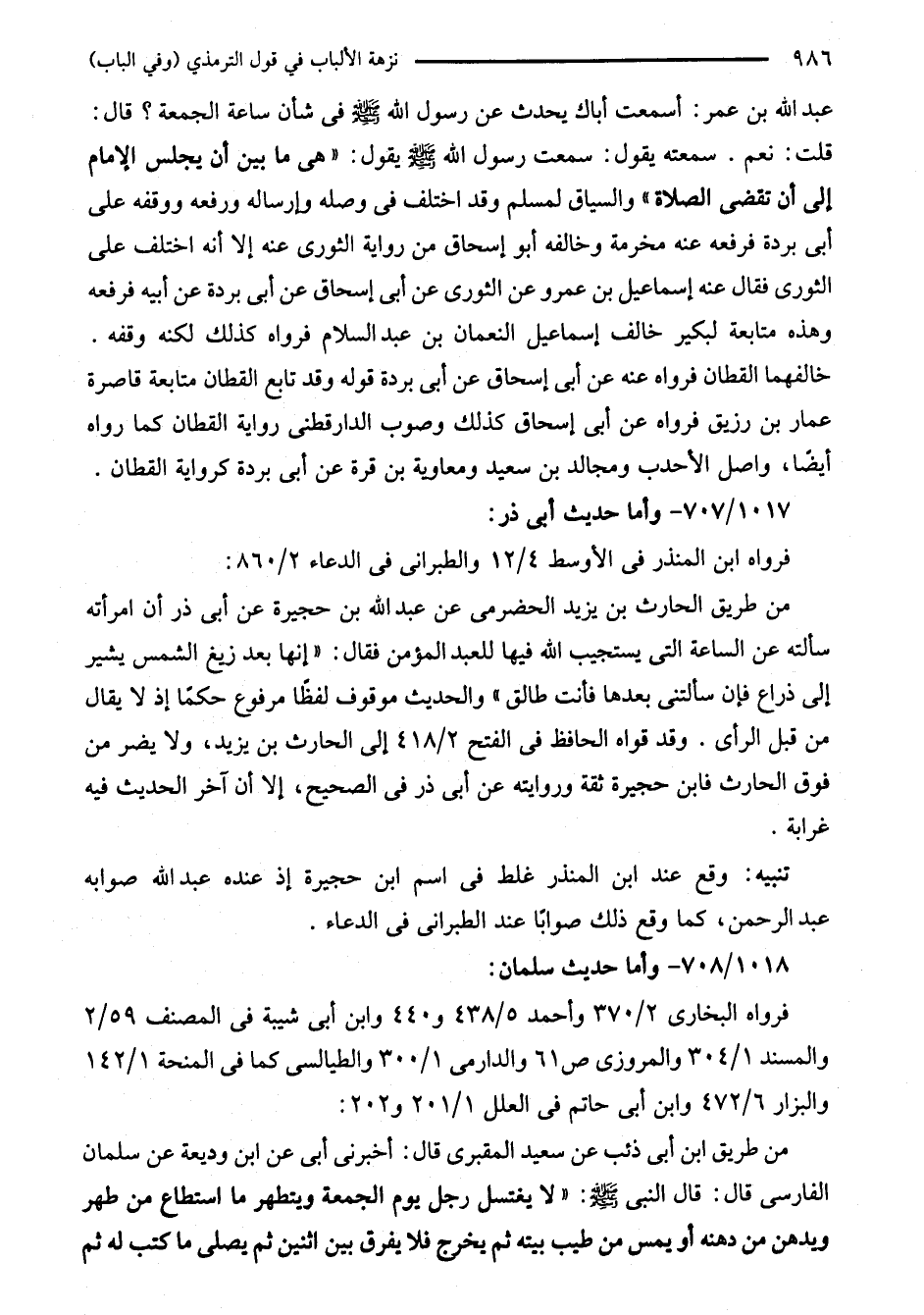 عبد الله بن عمر: أسمعت أباك يحدث عن رسول الله - صلى الله عليه وسلم - في شأن ساعة الجمعة؟ قال: قلت: نعم. سمعته يقول: سمعت رسول الله - صلى الله عليه وسلم - يقول: "هي ما بين أن يجلس الإمام إلى أن تقضى الصلاة" والسياق لمسلم وقد اختلف في وصله وإرساله ورفعه ووقفه على أبى بردة فرفعه عنه مخرمة وخالفه أبو إسحاق من رواية الثورى عنه إلا أنه اختلف على الثورى فقال عنه إسماعيل بن عمرو عن الثورى عن أبى إسحاق عن أبى بردة عن أبيه فرفعه وهذه متابعة لبكير خالف إسماعيل النعمان بن عبد السلام فرواه كذلك لكنه وقفه. خالفهما القطان فرواه عنه عن أبى إسحاق عن أبى بردة قوله وقد تابع القطان متابعة قاصرة عمار بن رزيق فرواه عن أبى إسحاق كذلك وصوب الدارقطني رواية القطان كما رواه أيضًا، واصل الأحدب ومجالد بن سعيد ومعاوية بن قرة عن أبى بردة كرواية القطان.