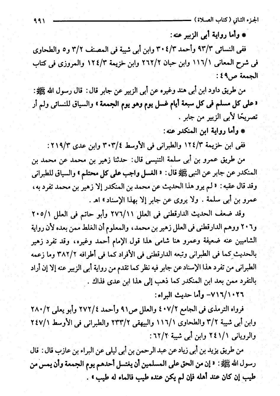 من طريق عمرو بن أبى سلمة التنيسى قال: حدثنا زهير بن محمد عن محمد بن المنكدر عن جابر عن النبي - صلى الله عليه وسلم - قال: "الغسل واجب على كل محتلم"والسياق للطبراني وقد قال عقبه: "لم يرو هذا الحديث عن محمد بن المنكدر إلا زهير بن محمد تفرد به، عمرو بن أبى سلمة. ولا يروى عن جابر إلا بهذا الاسناد" اهـ.