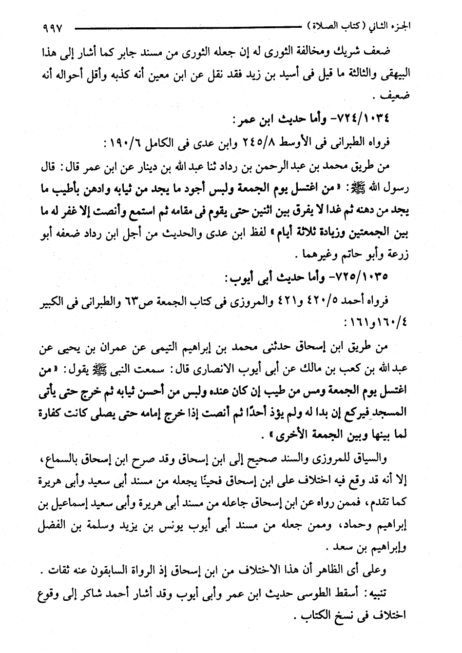 من طريق ابن إسحاق حدثنى محمد بن إبراهيم التيمى عن عمران بن يحيى عن عبد الله بن كعب بن مالك عن أبى أيوب الانصارى قال: سمعت النبي - صلى الله عليه وسلم - يقول: "من اغتسل يوم الجمعة ومس من طيب إن كان عنده ولبس من أحسن ثيابه ثم خرج حتى يأتى المسجد فيركع إن بدا له ولم يؤذ أحدًا ثم أنصت إذا خرج إمامه حتى يصلى كانت كفارة لما بينها وبين الجمعة الأخرى".