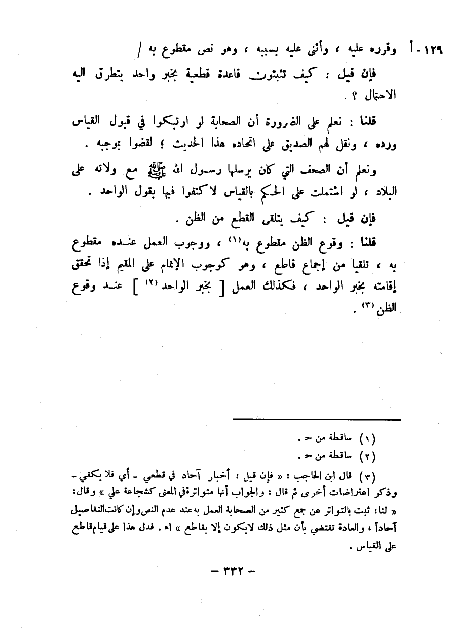 قال علماء الأصول شرطه استواء الطرفين والواسطة والحديث المتواتر عن رسول الله صلى الله عليه وسلم في عصر الصحابة ينبغي أن يتواتر عنهم في العصر الثاني فلو نقل الآحاد كونه متواترا لم يكف وهذا خطأ فإن خبر الواحد ليس له طرف وواسطة وكل من ينقل عنه قول وإن كان راويا فهو خبر في نفسه ولا بد من التواتر فيه فهذه أخبار لا بد من تواتر كل واحد منها والشرط الذي لا بد منه لتحصيل العلم أن يستند علم المخبرين إلى الحس والضرورة فأما ما علموه بالنظر كحدث العالم وغيره لا يعلم صدقهم فيه وإن بلغوا عدد التواتر