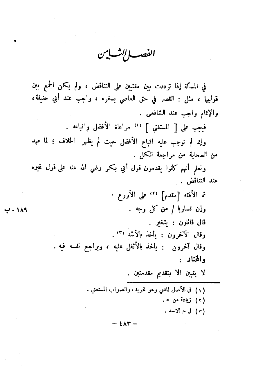 وعقد الباب تمييز الشبه عن الطرد ولا خفاء بتميزه عن المخيل فإن الشبه لا يناسب الحكم ويتميز عما في معنى الأصل فان ذلك يعلم بالبديهة فنقول التشابه المعتبر هو الذي يوهم الإجتماع في مخيل يناسب الحكم المطلوب وذلك المخيل مجهولا لا سبيل إلى ابدائه فإذا قلنا العبد يتصرف وتنفذ عبارته كالحر يشعر ذلك باجتماعهما في المخيل الذي هو مناط الملك فكأنه يفضي إلى الحكم بواسطة والطرد هو الذي لا يشعر بالحكم لا بنفسه ولا بواسطة والمخيل هو الذي يشعر بنفسه فيمس المقصود على وجه المناسبة وان شئت قلت الشبه ما يغلب على الظن كونه في معنى الاصل وهو مشابه لالحاق الشئ بما في معناه إلا ان ذلك مقطوح وفي به وهذا غالب على الظن
