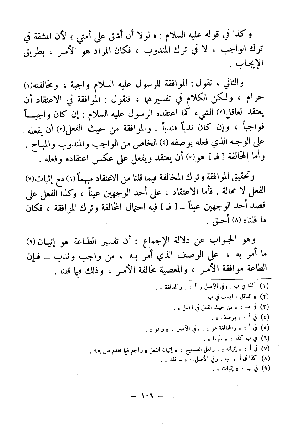 - والثاني، نقول: الموافقة للرسول عليه السلام واجبة، ومخالفته (¬1) حرام، ولكن الكلام في تفسيرهما، فنقول: الموافقة في الاعتقاد أن يعتقد العاقل (¬2) الشيء كما اعتقده الرسول عليه السلام: إن كان واجبًا فواجبًا، وإن كان ندبًا فندبًا. والموافقة من حيث الفعل (¬3) أن يفعله على الوجه الذي فعله بوصفه (¬4) الخاص كل من الواجب والمندوب والمباح. وأما المخالفة [فـ]، هو (¬5) أن يعتقد ويفعل على عكس اعتقاده وفعله.