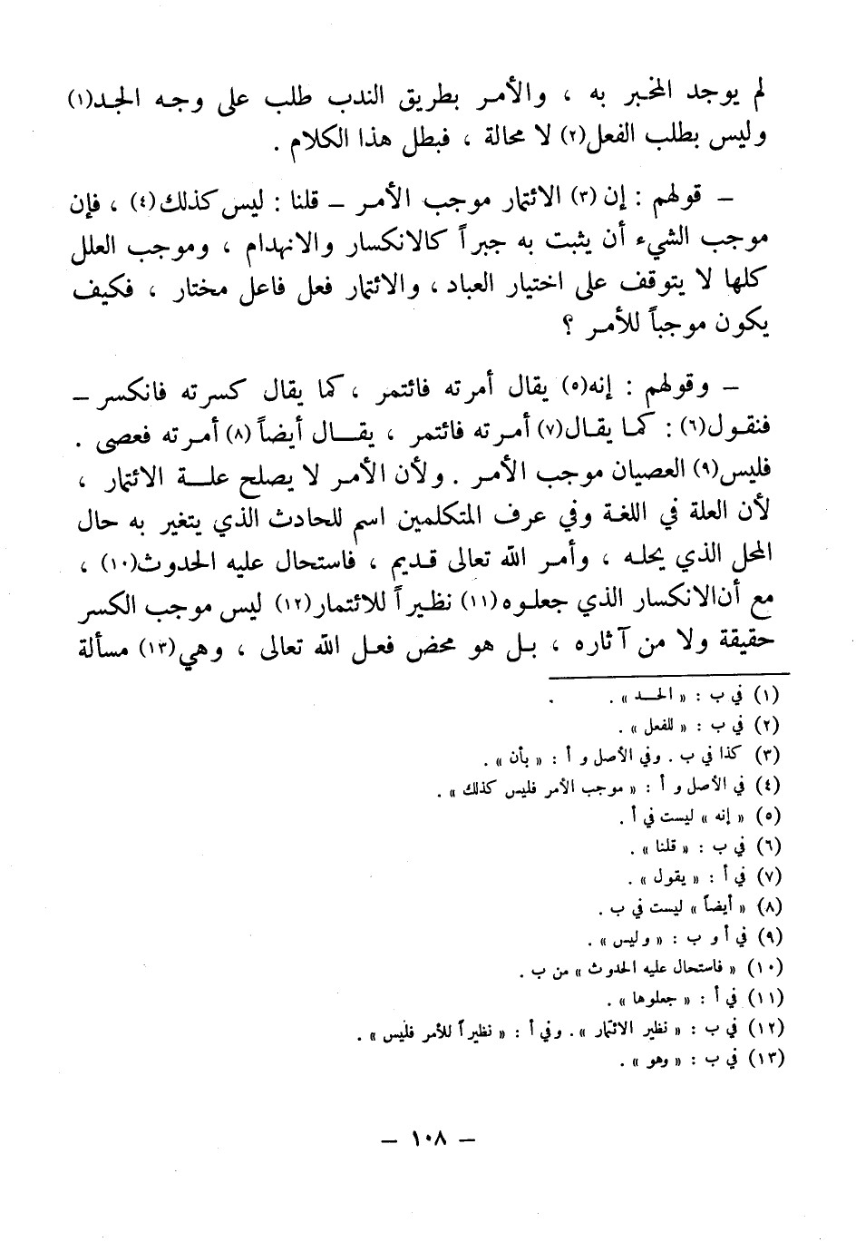 - وقولهم: إنه (¬5) يقال أمرته فائتمر، كما يقال كسرته فانكسر- فنقول (¬6): كما يقال (¬7) أمرته فائتمر، يقال أيضًا (¬8) أمرته فعصى. فليس (¬9) العصيان موجب الأمر. ولأن الأمر لا يصلح علة الائتمار، لأن العلة في اللغة وفي عرف المتكلمين اسم للحادث الذي يتغير به حال المحل الذي يحله، وأمر الله تعالى قديم، فاستحال عليه الحدوث (¬10)، مع أن الانكسار الذي جعلوه (¬11) نظيرًا للائتمار (¬12) ليس موجب الكسر حقيقة ولا من آثاره، بل هو محض فعل الله تعالى، وهي (¬13) مسألة