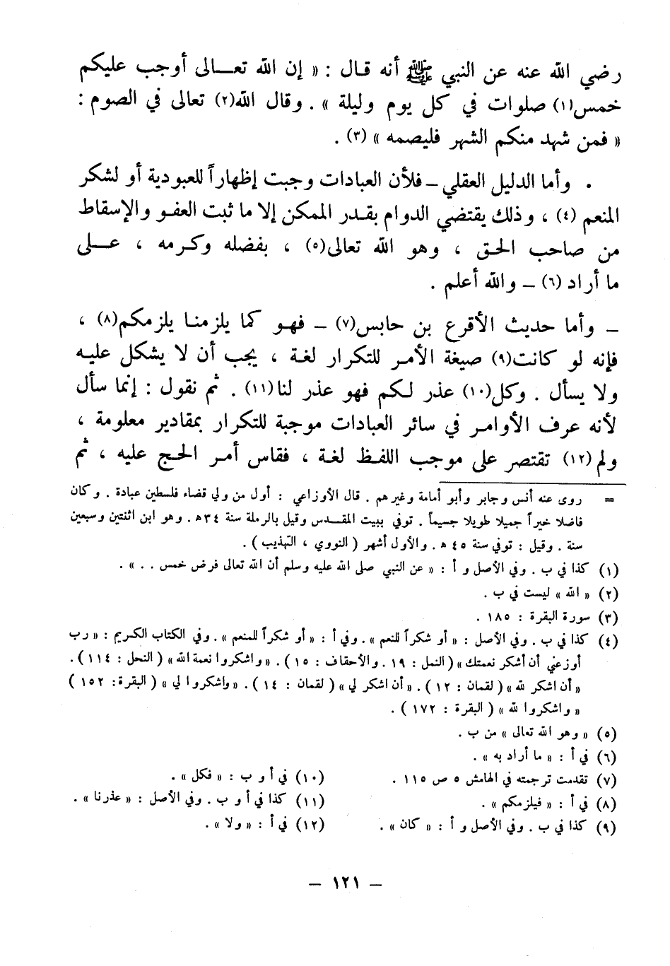 (¬4) كذا في ب. وفي الأصل: "أو شكراً للنعم". وفي أ: "أو شكراً للمنعم". وفي الكتاب الكريم: "رب أوزعني أن أشكر نعمتك" (النمل: 19. والأحقاف: 15). "واشكروا نعمة الله" (النحل: 114). "أن اشكر الله" (لقمان: 12). "أن اشكر لي" (لقمان: 14). "واشكروا لي" (البقرة: 152) "واشكرو الله" (البقرة: 172).