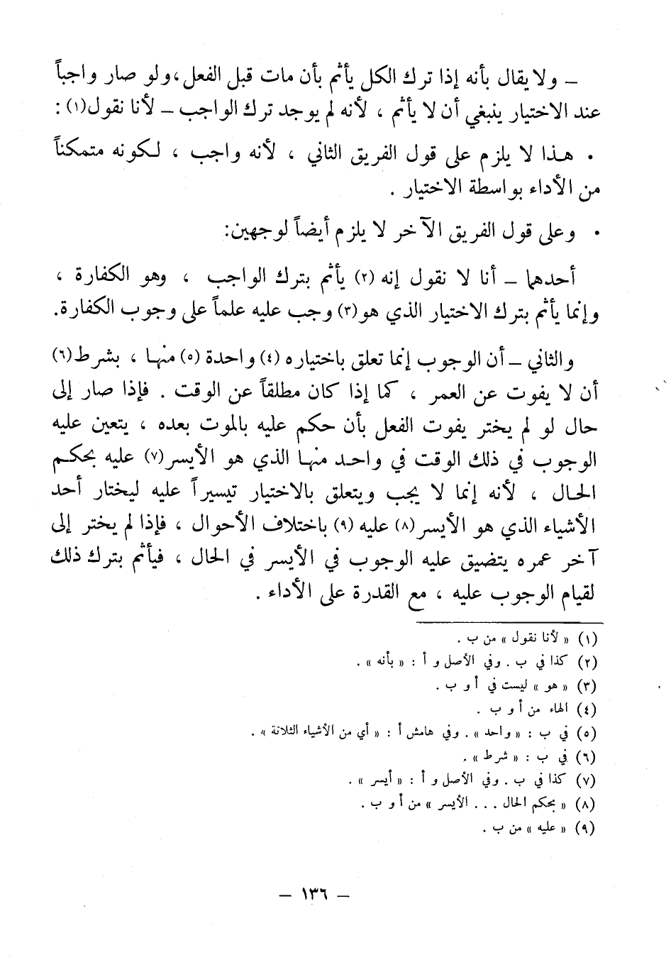 - ولا يقال بأنه إذا ترك الكل يأثم بأن مات قبل الفعل، ولو صار واجباً عند الاختيار ينبغي أن لا يأثم، لأنه لم يوجد ترك الواجب - لأنا نقول (¬1):