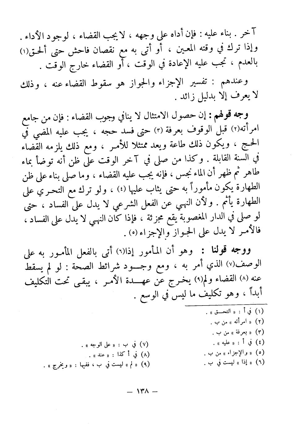 وجه قولهم: إن حصول الامتثال لا ينافي وجوب القضاء: فإن من جامع امرأته (¬2) قبل الوقوف بعرفة (¬3) حتى فسد حجه، يجب عليه المضي في الحج، ويكون ذلك طاعة ويعد ممتثلا للأمر، ومع ذلك يلزمه القضاء في السنة القابلة. وكذا من صلى في آخر الوقت على ظن أنه توضأ بماء طاهر ثم ظهر أن الماء نجس، فإنه يجب عليه القضاء، وما صلى بناء على ظن الطهارة يكون مأموراً به حتي يثاب عليها (¬4)، ولو ترك مع التحري على الطهارة يأثم. ولأن النهي عن الفعل الشرعي لا يدل على الفساد، حتى لو صلى في الدار المغصوبة يقع مجزئة، فإذا كان كان النهي لا يدل على الفساد، فالأمر لا يدل على الجواز والإجزاء (¬5).