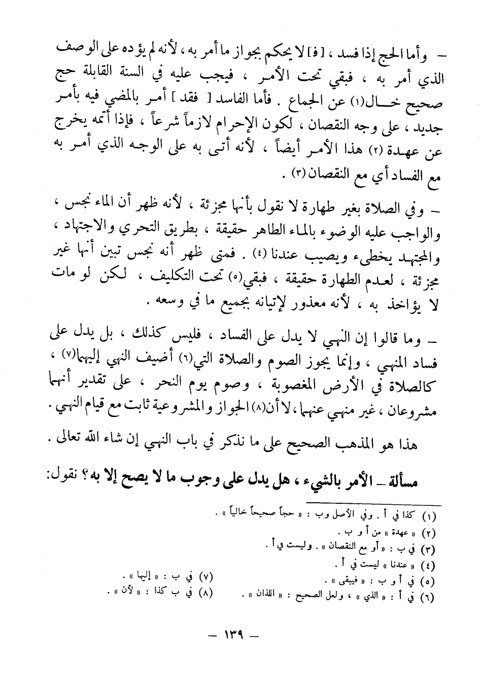 - وأما الحج إذا فسد، [فـ] لا يحكم بجواز ما أمر به، لأنه لم "يؤده على الوصف الذي أمر به، فبقي تحت الأمر، فيجب عليه في السنة القابلة حج صحيح خال (¬1) عن الجماع. فأما الفاسد [فقد] أمر بالمضي فيه بأمر جديد، على وجه النقصان، لكون الإحرام لازماً شرعاً، فإذا أتمه يخرج عن عهدة (¬2) هذا الأمر أيضاً، لأنه أتى به على الوجه الذي أمر به مع الفساد أي مع النقطان (¬3).