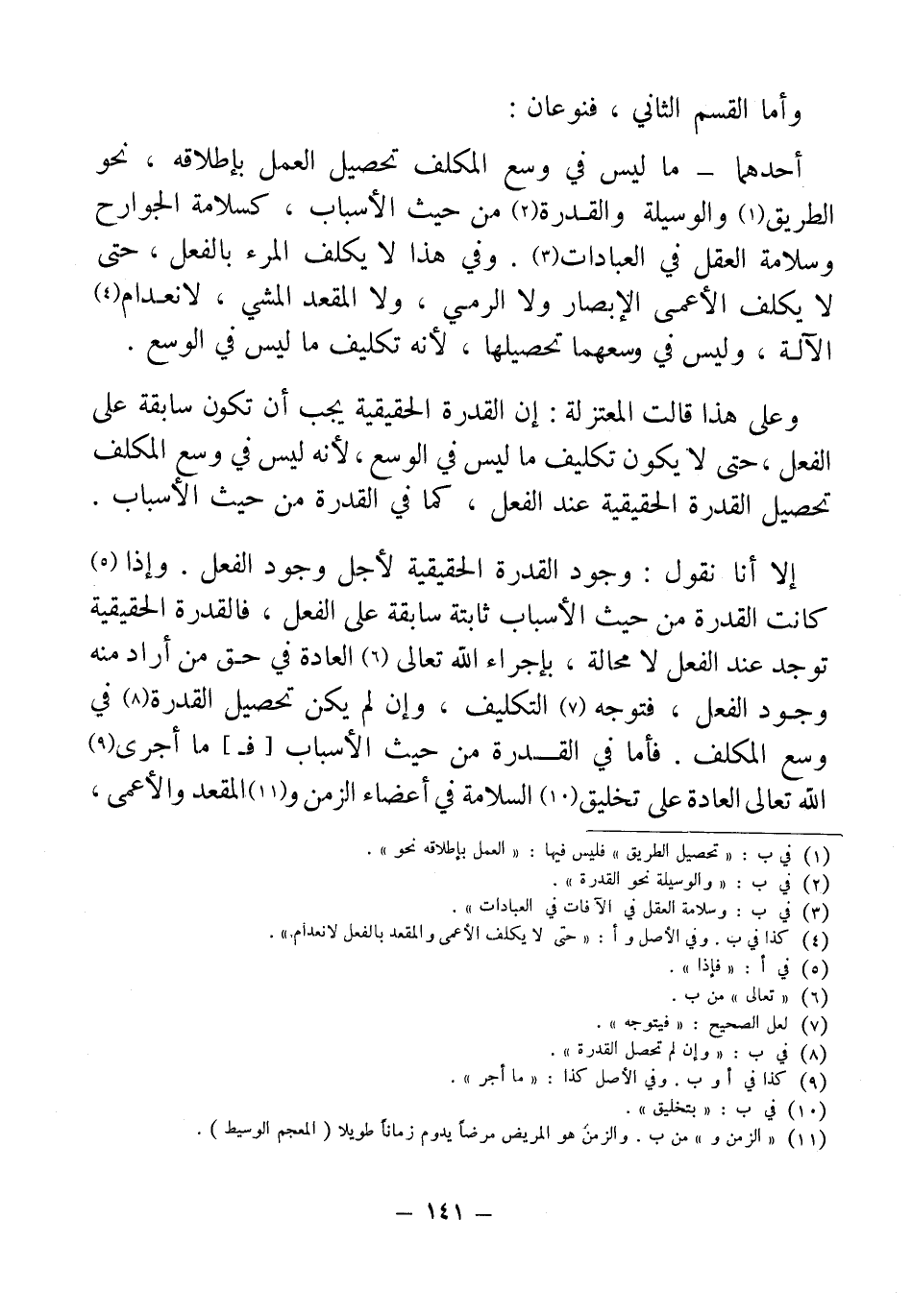 وعلى هذا قالت المعتزلة: إن القدرة الحقيقية يجب أن تكون سابقة على الفعل، حتى لا يكون تكليف كل ما ليس في الوسع، لأنه ليس في وسع المكلف تحصيل القدرة الحقيقية عند الفعل، كما في القدرة من حيث الأسباب.