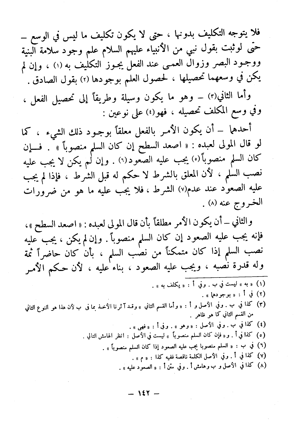 والثاني - أن يكون الأمر مطلقاً بأن قال المولى لعبده: "اصعد السطح"، فإنه يجب عليه الصعود إن كان السلم منصوباً. وإن لم يكن، يجب عليه نصب السلم إذا كان متمكناً من نصب السلم، بأن كان حاضراً ثمة وله قدرة نصبه، ويجب عليه الصعود، بناء عليه، لأن حكم الأمر
