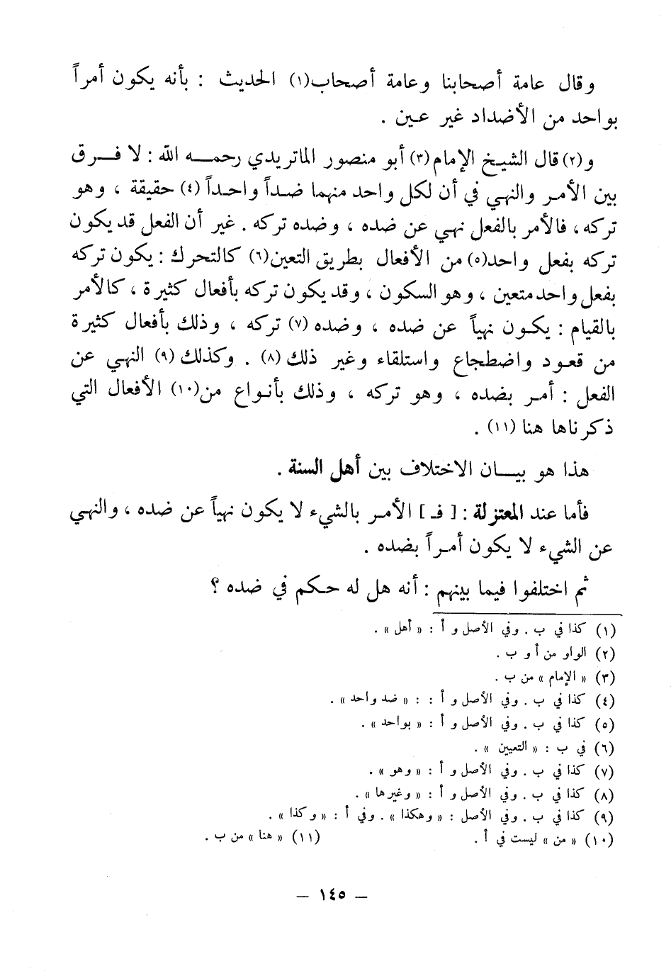 و (¬2) قال الشيخ الإمام (¬3) أبو منصور الماتريدي رحمه الله: لا فرق بين الأمر والنهي في أن لكل واحد منهما ضداً واحداً (¬4) حقيقة، وهو تركه, فالأمر بالفعل نهي عن ضده، وضده تركه. غير أن الفعل قد يكون تركه بفعل واحد (¬5) من الأفعال بطريق التعين (¬6) كالتحرك: يكون تركه بفعل واحد متعين، وهو السكون، وقد يكون تركه بأفعال كثيرة، كالأمر بالقيام: يكود نهياً عن ضده، وضده (¬7) تركه، وذلك بأفعال كثيرة من قعود واضطجاع واستلقاء وغير ذلك (¬8). وكذلك (¬9) النهي عن الفعل: أمر ضده، وهو تركه، وذلك بأنواع من (¬10) الأفعال التي ذكرناها هنا (¬11).