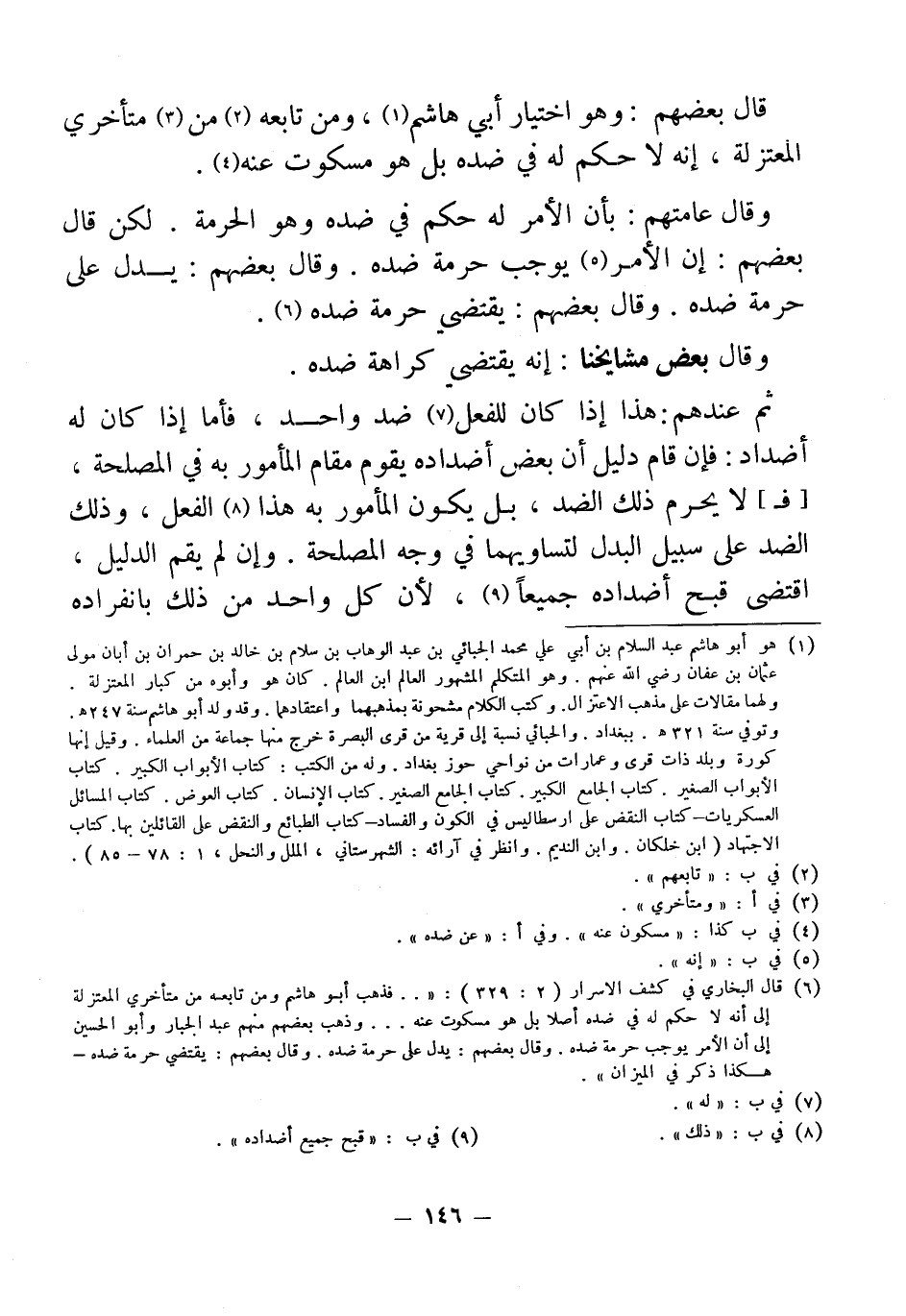 (¬6) قال البخاري في كشف الأسرار (2: 329): " .. فذهب أبو هاشم ومن تابعه من متأخري المعتزلة إلى أنه لا حكم له في ضده أصلا بل هو مسكوت عنه ... وذهب بعضهم منهم عبد الجبار وأبو الحسين إلى أن الأمر يوجب حرمة ضده. وقال بعضهم: يدل على حرمة ضده. وقال بعضهم: يقتضي حرمة ضده - هكذا ذكر في الميزان".