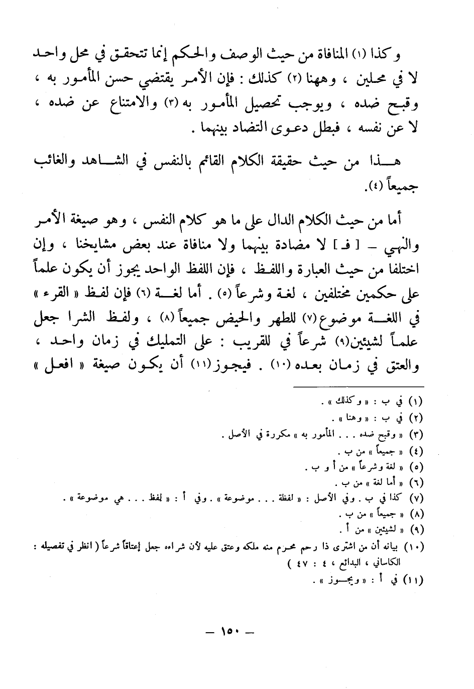 أما من حيث الكلام الدال على ما هو كلام النفس، وهو صيغة الأمر والنهي -[فـ] لا مضادة بينهما ولا منافاة عند بعض مشايخنا، وإن اختلفا من حيث العبارة واللفظ، فإن اللفظ الواحد يجوز أن يكون علماً على حكمين مختلفين، لغة وشرعاً (¬5). أما لغة (¬6) فإن لفظ "القرء" في اللغة موضوع (¬7) للطهر والحيض جميعاً (¬8)، ولفظ الشرا جعل علماً، لشيئين (¬9) شرعاً في للقريب: على التمليك في زمان واحد، والعتق في زمان بعده (¬10). فيجوز (¬11) أن يكون صيغة "افعل"