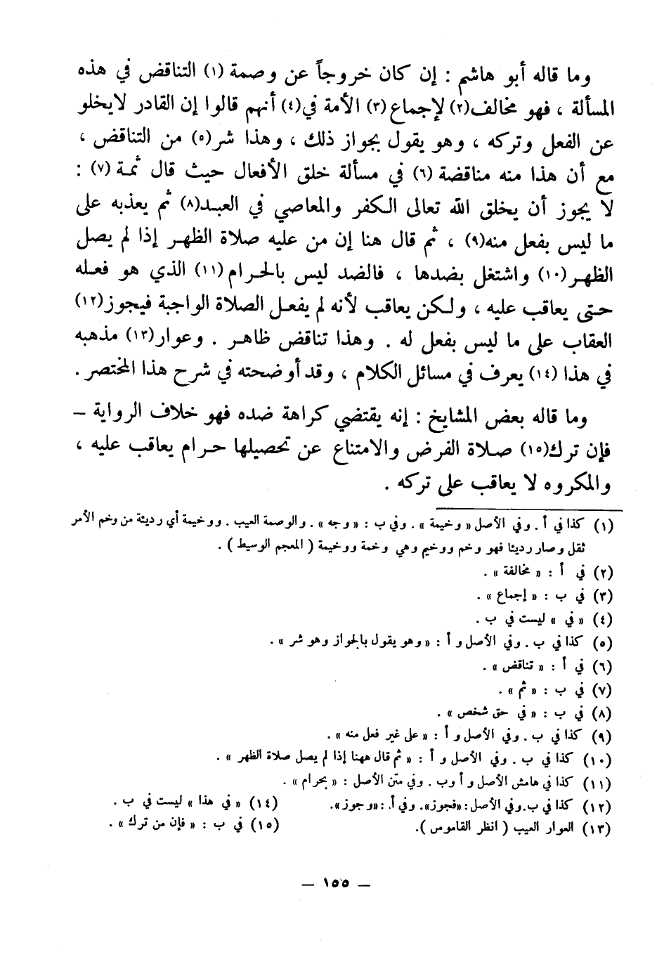 وما قاله أبو هاشم: إن كان خروجاً عن وصمة (¬1) التناقض في هذه المسألة، فهو مخالف (¬2) لإجماع (¬3) الأمة في (¬4) أنهم قالوا إن القادر لا يخلو عن الفعل وتركه، وهو يقول بجواز ذلك، وهذا شر (¬5) من التناقض، مع أن هذا منه مناقضة (¬6) في مسألة خلق الأفعال حيث قال ثمة (¬7): لا يجوز أن يخلق الله تعالى الكفر والمعاصي في العبد (¬8) ثم يعذبه على ما ليس بفعل منه (¬9)، ثم قال هنا إن من عليه صلاة الظهر إذا لم يصل الظهر (¬10) واشتغل بضدها، فالضد ليس بالحرام (¬11) الذي هو فعله حتى يعاقب عليه، ولكن يعاقب لأنه لم يفعل الصلاة الواجبة في جوز (¬12) العقاب على ما ليس بفعل له. وهذا تناقض ظاهر. وعوار (¬13) مذهبه في هذا (¬14) يعرف في مسائل الكلام، وقد أوضحته في شرح هذا المختصر.