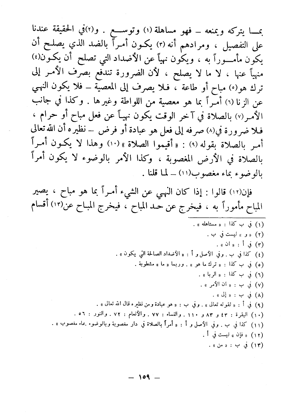 بما يتركه ويمنعه - فهو مساهلة (¬1) وتوسع. و (¬2) في الحقيقة عندنا على التفصيل، ومرادهم أنه (¬3) يكون أمراً بالضد الذي يصلح أن يكون مأموراً به، ويكون نهياً عن الأضداد التي تصلح أن يكون (¬4) منهيا عنها, لا ما لا يصلح، لأن الضرورة تندفع بصرف الأمر إلى ترك هو (¬5) مباح أو طاعة، فلا يصرف إلى المعصية - فلا يكون النهي عن الزنا (¬6) أمراً بما هو معصية من اللواطة وغيرها. وكذا في جانب الأمر (¬7) بالصلاة في آخر الوقت يكون نهياً عن فعل مباح أو حرام، فلا ضرورة في (¬8) صرفه إلى فعل هو عبادة أو فرض - نظيره أن الله تعالى أمر بالصلاة بقوله (¬9): "أقيموا الصلاة" (¬10) وهذا لا يكون أمراً بالصلاة في الأرض المغصوبة، وكذا الأمر بالوضوء لا يكون أمراً لي الوضوء بماء مغصوب (¬11) - لما قلنا.