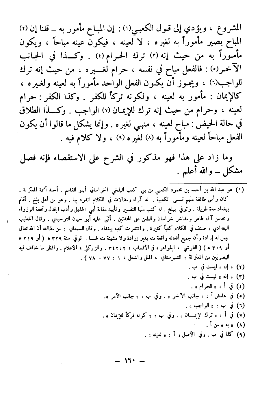 (¬1) هو عبد الله بن أحمد بن محمود الكعبي من بي كعب البلخي الحراساني أبو القاسم. أحد أئمة المعتزلة. كان رأس طائفة منهم تسمى الكعبية. له آراه ومقالات في الكلام انفرد بها. وهو من أهل بلخ. أقام ببغداد مدة طويلة. وتوفي ببلخ. له كتب منها التفسير وتأييد مقالة أبي الهذيل وأدب الجدل وتحفة الوزراء ومحاسن آل طاهر ومفاخر خراسان والطعن على المحدثين. أثنى عليه أبو حيان التوحيدي. وقال الخطيب البغدادي: صنف في الكلام كتباً كثيرة. وانتشرت كتبه ببغداد. وقال السمعاني: من مقالته أن الله تعالى ليس له إرادة وأن جميع أفعاله واقعة منه بغير إرادة ولا مشيئة منه لها. توفي سنة 329 هـ (أو 319 هـ أو 309 هـ) (القرشي، الجواهر، في الأنساب، 2: 342 والزركلي، الأعلام. وانظر ما خالف فيه البصريين من المعتزلة: الشهرستاني، الملل والنحل، 1: 77 - 78).