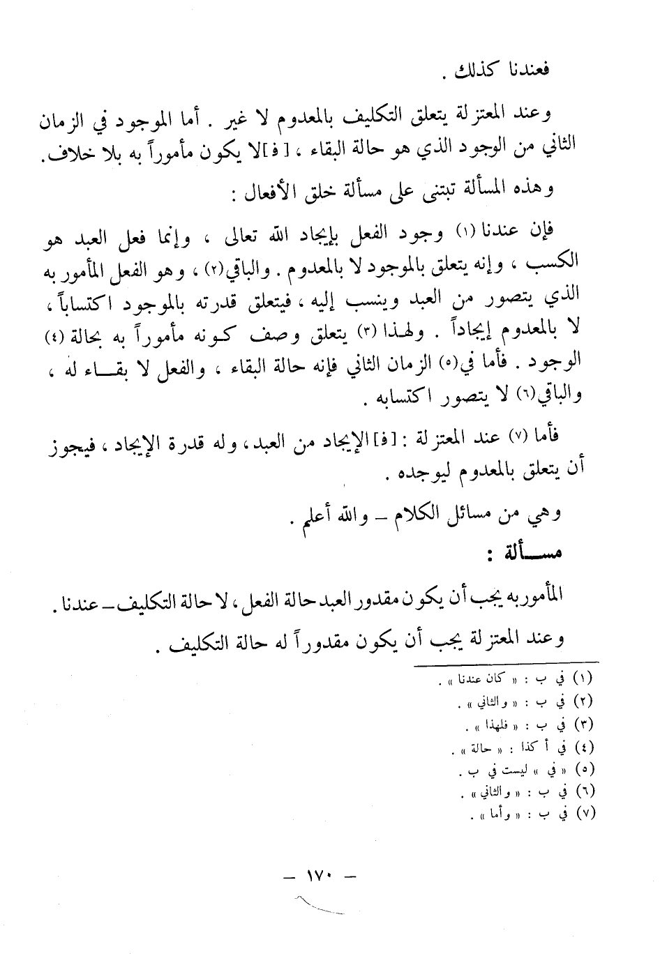 وعند المعتزلة يتعلق التكليف بالمعدوم لا غير. أما الموجود في الزمان الثاني من الوجود الذي هو حالة البقاء، [فـ] لا يكون مأمورًا به بلا خلاف.