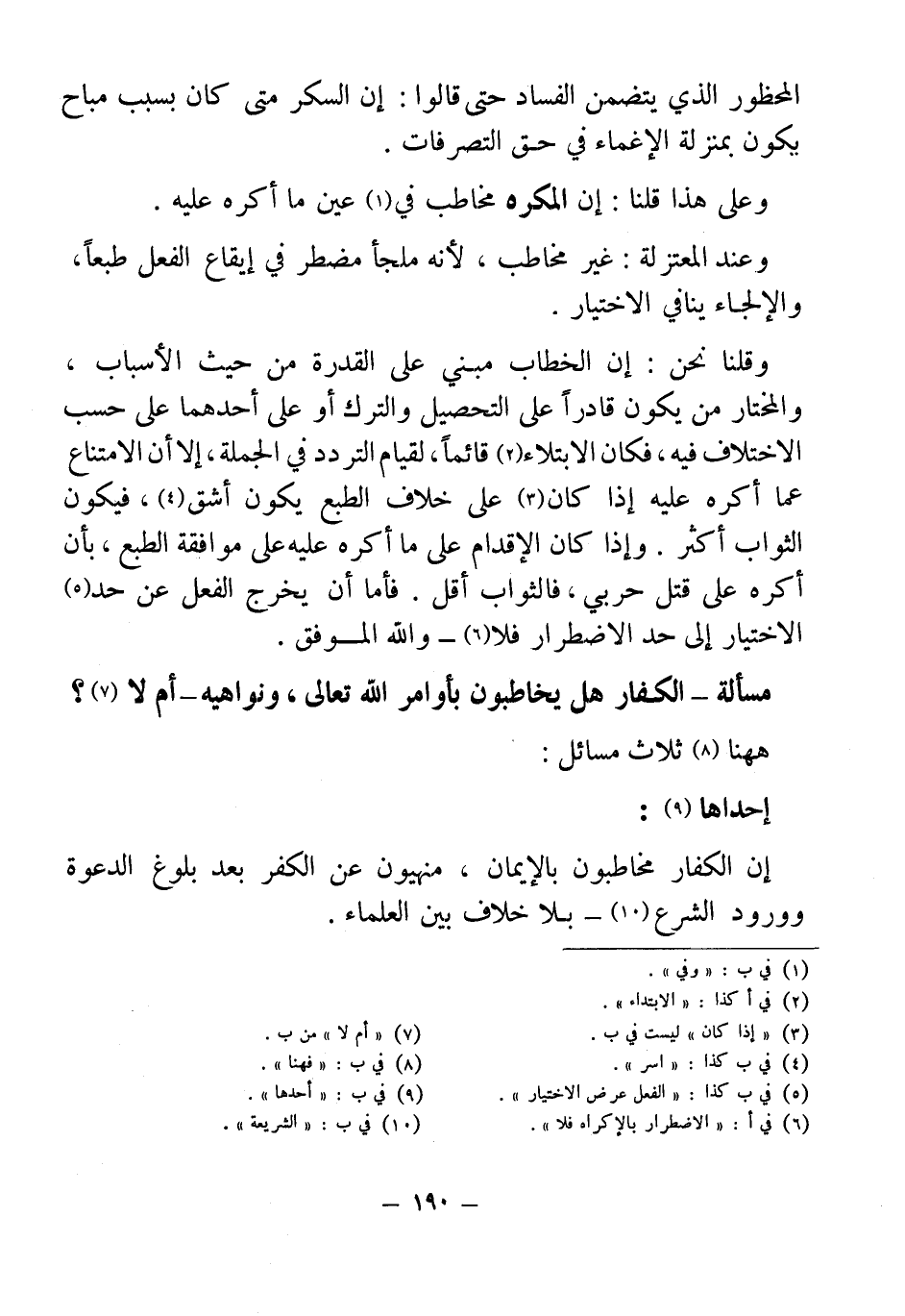 وقلنا نحن: إن الخطاب مبني على القدرة من حيث الأسباب، والمختار من يكون قادرًا على التحصيل والترك أو على أحدهما على حسب الاختلاف فيه، فكان الابتلاء (¬2) قائمًا، لقيام التردد في الجملة، إلا أن الامتناع عما أكره عليه إذا كان (¬3) على خلاف الطبع يكون أشق (¬4)، فيكون الثواب أكثر. وإذا كان الإقدام على ما أكره عليه على موافقة الطبع، بأن أكره على قتل حربي، فالثواب أقل. فأما أن يخرج الفعل عن حد (¬5) الاختيار إلى حد الاضطرار فلا (¬6) - والله الموفق.