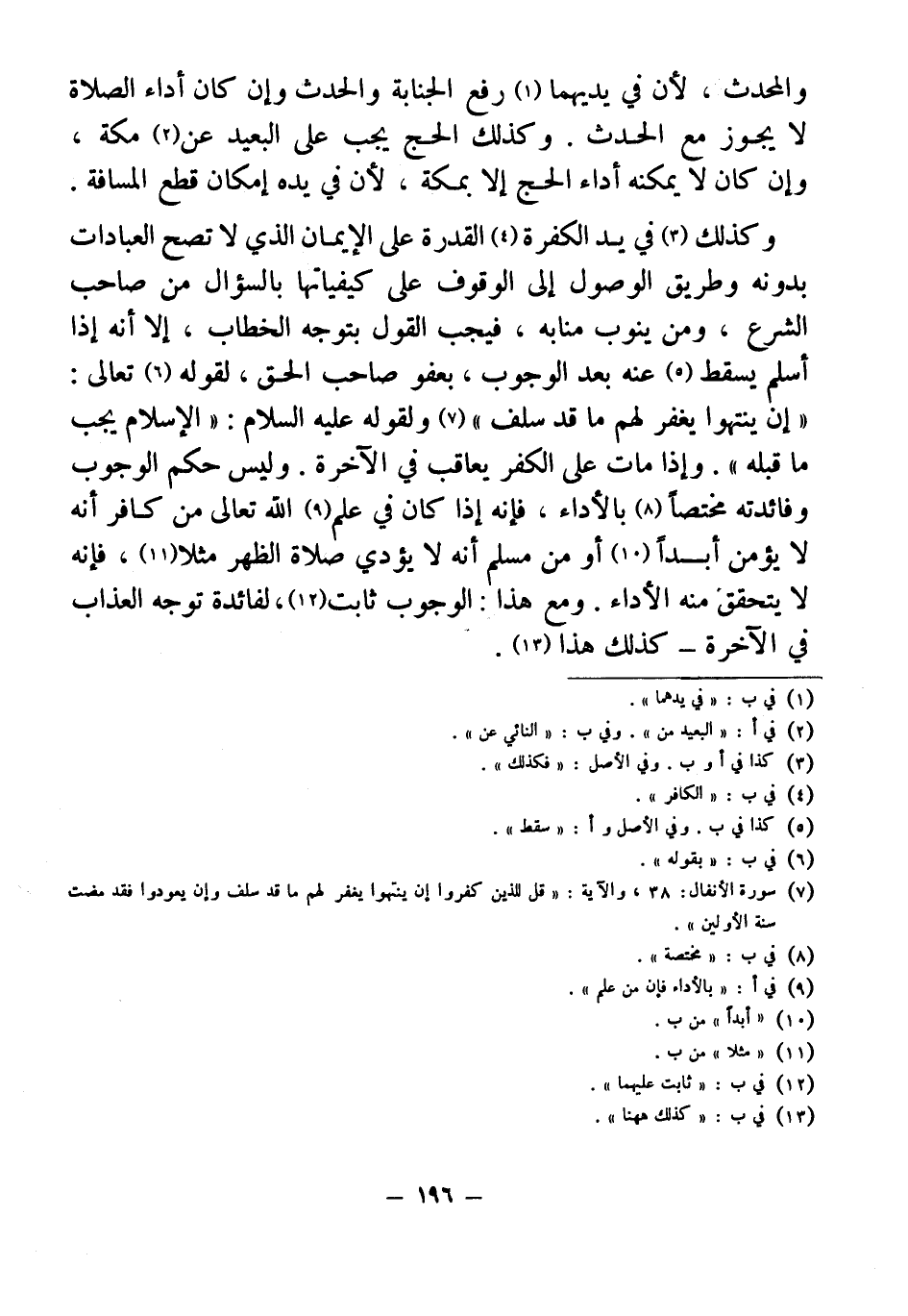 وكذلك (¬3) في يد الكفرة (¬4) القدرة على الإيمان الذي لا تصح العبادات بدونه وطريق الوصول إلى الوقوف على كيفياتها بالسؤال من صاحب الشرع، ومن ينوب منابه، فيجب القول بتوجه الخطاب، إلا أنه إذا أسلم يسقط (¬5) عنه بعد الوجوب، بعفو صاحب الحق، لقوله (¬6) تعالى: {إِنْ يَنْتَهُوا يُغْفَرْ لَهُمْ مَا قَدْ سَلَفَ} (¬7) ولقوله عليه السلام: "الإسلام يجب ما قبله". وإذا مات على الكفر يعاقب في الآخرة. وليس حكم الوجوب وفائدته مختصاً (¬8) بالأداء، فإنه إذا كان في علم (¬9) الله تعالى من كافر أنه لا يؤمن أبدًا (¬10) أو من مسلم أنه لا يؤدي صلاة الظهر مثلا (¬11)، فإنه لا يتحقق منه الأداء. ومع هذا: الوجوب ثابت (¬12)، لفائدة توجه العذاب في الآخرة - كذلك هذا (¬13).