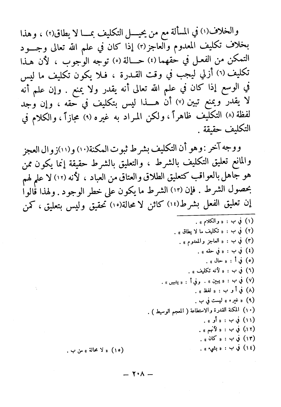 ووجه آخر: وهو أن التكليف بشرط ثبوت المكنة (¬10) و (¬11) زوال العجز والماعن تعليق التكليف بالشرط، والتعليق بالشرط حقيقة إنما يكون ممن هو جاهل بالعواقب كتعليق الطلاق والعتاق من العباد, لأنه (¬12) لا علم لهم بحصول الشرط. فإن (¬13) الشرط ما يكون على خطر الوجود. ولهذا قالوا إن تعليق الفعل بشرط (¬14) كائن لا محالة (¬15) تحقيق وليس بتعليق، كن
