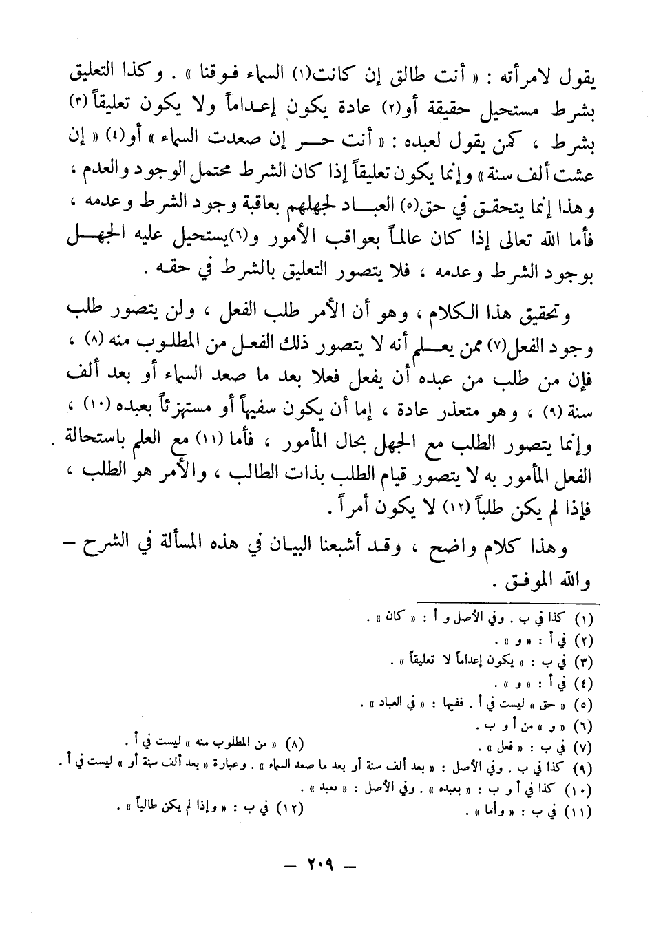 وتحقيق هذا الكلام، وهو أن الأمر طلب الفعل، ولن يتصور طلب وجود الفعل (¬7) ممن يعلم أنه لا يتصور ذلك الفعل من المطلوب منه (¬8)، فإن من طلب من عبده أن يفعل فعلا بعد ما صعد السماء أو بعد ألف سنة (¬9)، وهو متعذر عادة، إما أن يكون سفيهًا أو مستهزئًا بعبد (¬10)، وإنما يتصور الطلب مع الجهل بحال المأمور، فأما (¬11) مع العلم باستحالة الفعل المأمور به لا يتصور قيام الطلب بذات الطالب، والأمر هو الطلب، فإذا لم يكن طلبًا (¬12) لا يكون أمرًا.