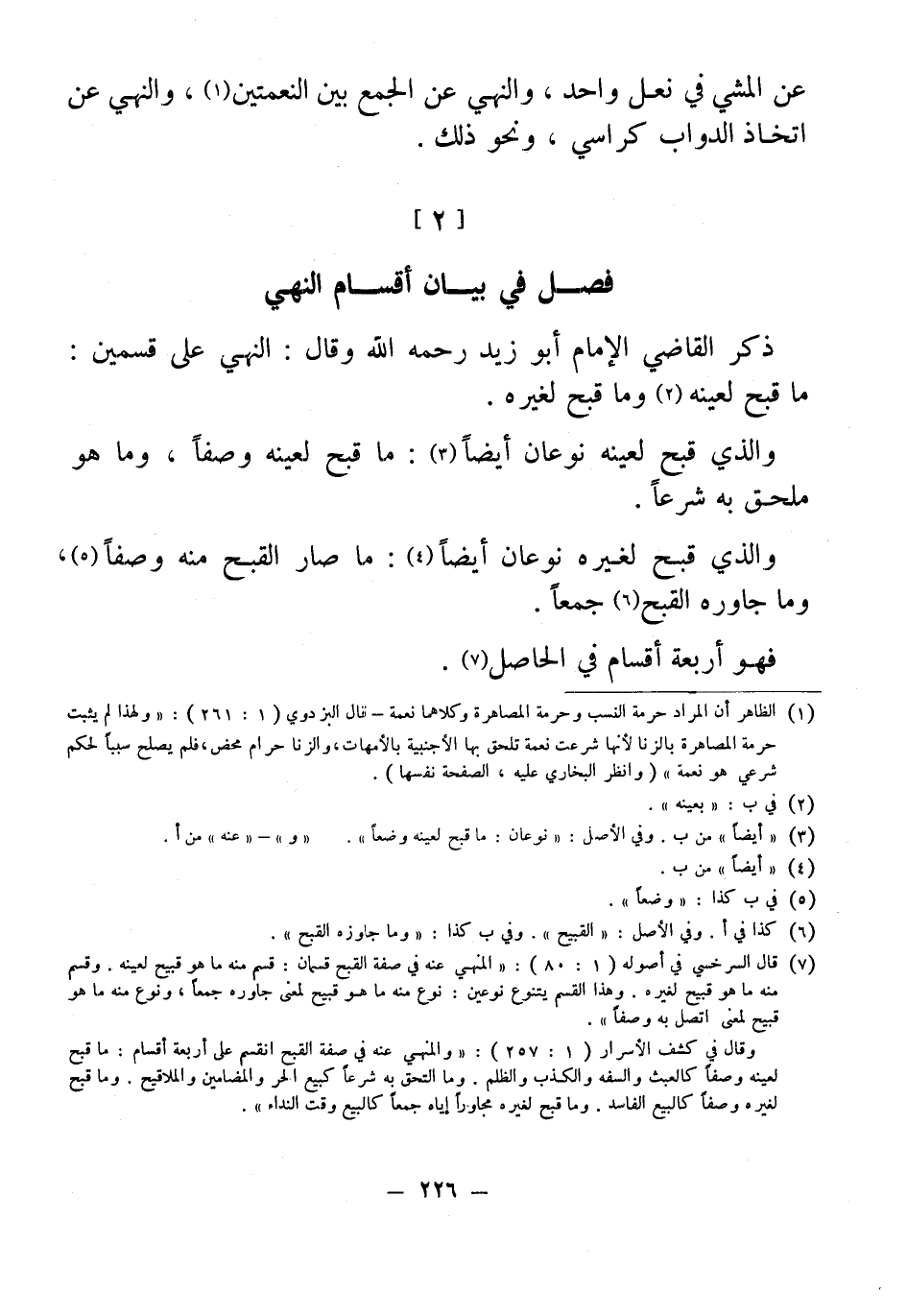 وقال في كشف الأسرار (1: 257): "والمنهي عنه في صفة القبح انقسم على أربعة أقسام: ما قبح لعينه وصفًا كالعبث والسفه والكذب والظلم. وما التحق به شرعًا كبيع الحر والمضامين والملاقيح. وما قبح لغيره وصفًا كالبيع الفاسد. وما قبح لغيره مجاورًا إياه جمعًا كالبيع وقت النداء".