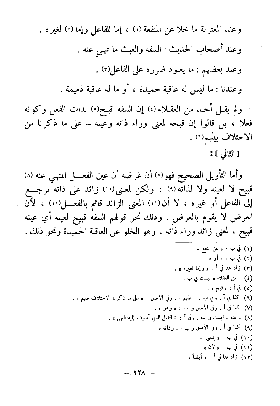 ولم يقل أحد من العقلاء (¬4) إن السفه قبح (¬5) لذات الفعل وكونه فعلَا، بل قالوا إن قبحه لمعنى وراء ذاته وعينه - على ما ذكرنا من الاختلاف بينهم (¬6).