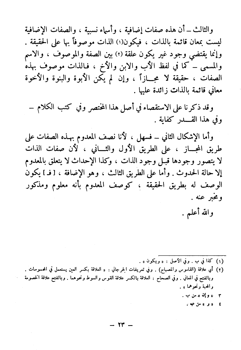 والثالث - أن هذه صفات إضافية، وأسماء نسبية، والصفات الإضافية ليست بمعان قائمة بالذات، فيكون (¬1) الذات موصوفاً بها على الحقيقة. وإنما يقتضي وجود غير يكون علقة (¬2) بين الصفة والموصوف، والاسم والمسمى- كما في لفظ الأب والابن والأخ، فالذات موصوف بهذه الصفات، حقيقة لا مجازاً، وإن (¬3) لم يكن الأبوة والبنوة والأخوة معاني قائمة بالذات زائدة عليها.