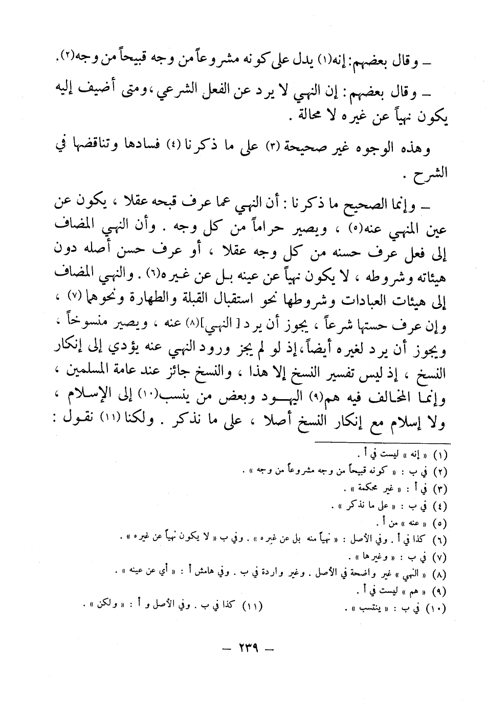 - وإنما الصحيح ما ذكرنا: أن النهي عما عرف قبحه عقلًا، يكون عن عين المنهي عنه (¬5)، ويصير حرامًا من كل وجه. وأن النهي المضاف إلى فعل عرف حسنه من كل وجه عقلا، أو عرف حسن أصله دون هيئاته وشروطه، لا يكون نهيًا عن عينه بل عن غيره (¬6). والنهي المضاف إلى هيئات العبادات وشروطها نحو استقبال القبلة والطهارة ونحوهما (¬7)، وإن عرف حستها شرعًا، يجوز أن يرد [النهي] (¬8) عنه ويصير منسوخًا ويجوز أن يرد لغيره أيضًا، إذ لو لم يجز ورود النهي عنه يؤدي إلى إنكار النسخ، إذ ليس تفسير النسخ إلا هذا، والنسخ جائز عند عامة المسلمين، وإنما المخالف فيه هم (¬9) اليهود وبعض من ينسب (¬10) إلى الإِسلام، ولا إسلام مع إنكار النسخ أصلا، على ما نذكر. ولكنا (¬11) نقول: