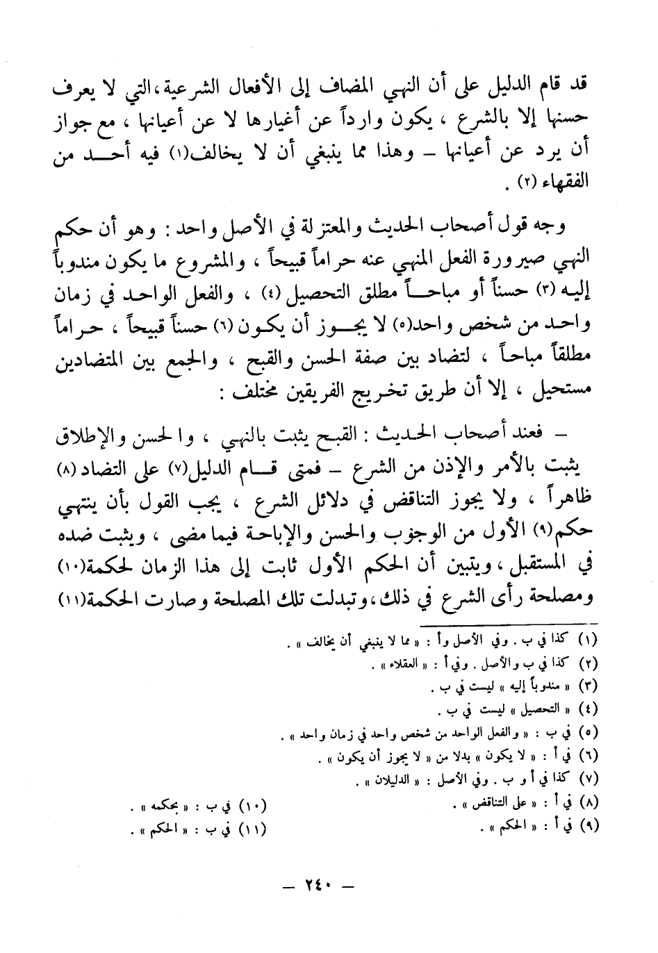 وجه قول أصحاب الحديث والمعتزلة في الأصل واحد: وهو أن حكم النهي صيرورة الفعل المنهي عنه حرامًا قبيحًا، والمشروع ما يكون مندوبًا إليه (¬3) حسنًا أو مباحًا كل طلق التحصيل (¬4)، والفعل الواحد في زمان واحد من شخص واحد (¬5) لا يجوز أن يكون (¬6) حسنًا قبيحًا، حرامًا مطلقًا مباحًا، لتضاد بين صفة الحسن والقبح، والجمع بين المتضادين مستحيل، إلا أن طريق تخريج الفريقين مختلف: