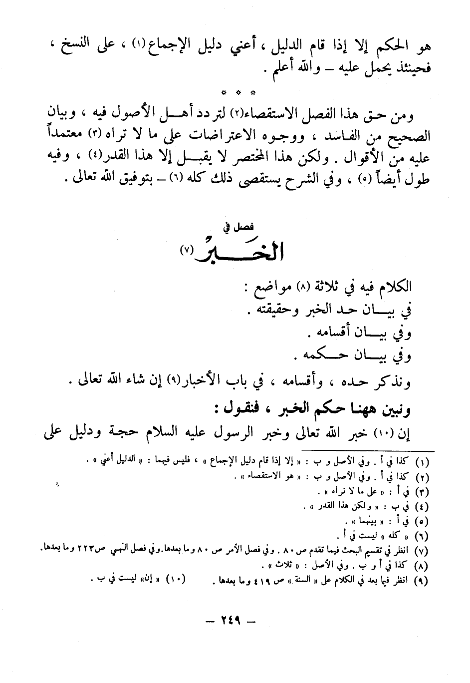 ومن حق هذا الفصل الاستقصاء (¬2) لتردد أهل الأصول فيه، وبيان الصحيح من الفاسد، ووجوه الاعتراضات على ما لا تراه (¬3) معتمدًا عليه من الأقوال. ولكن هذا المختصر لا يقبل إلا هذا القدر (¬4)، وفيه طول أيضًا (¬5)، وفي الشرح يستقصى ذلك كله (¬6) - بتوفيق الله تعالى.