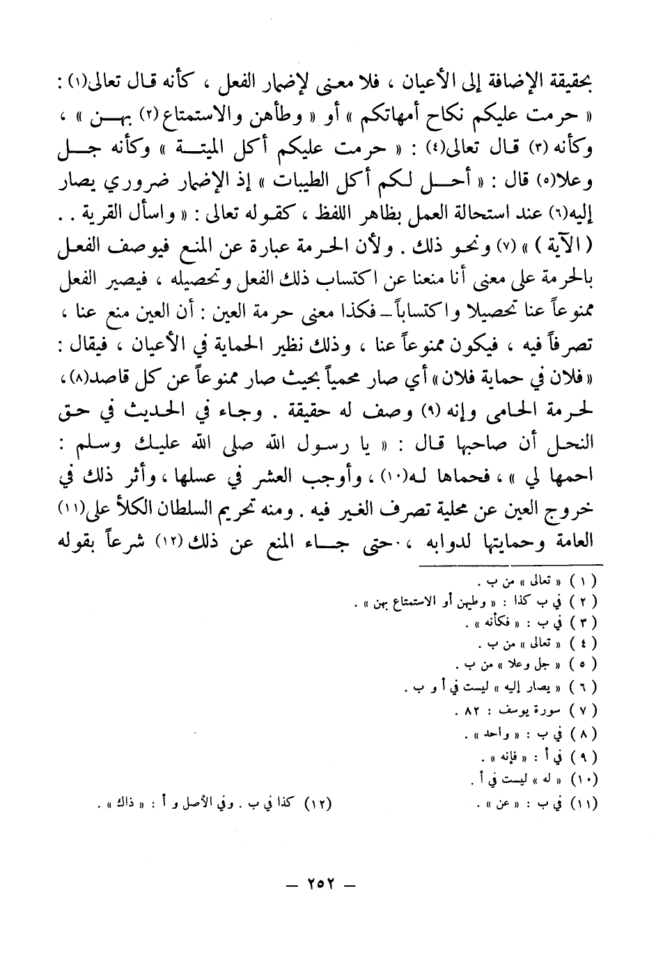بحقيقة الإضافة إلى الأعيان، فلا معنى لإضمار الفعل، كأنه قال تعالى (¬1): "حرمت عليكم نكاح أمهاتكم" أو "وطأهن والاستمتاع (¬2) بهن"، وكأنه (¬3) قال تعالى (¬4): "حرمت عليكم أكل الميتة" وكأنه جل وعلا (¬5) قال: "أحل لكم أكل الطيبات" إذ الإضمار ضروري يصار إليه (¬6) عند استحالة العمل بظاهر اللفظ، كقوله تعالى: "واسأل القرية .. (الآية) " (¬7) ونحو ذلك. ولأن الحرمة عبارة عن المنع فيوصف الفعل بالحرمة على معنى أنا منعنا عن اكتساب ذلك الفعل وتحصيله، فيصير الفعل ممنوعًا عنا تحصيلا واكتسابًا - فكذا معنى حرمة العين: أن العين منع عنا، تصرفًا فيه، فيكون ممنوعًا عنا، وذلك نظير الحماية في الأعيان، في قال: "فلان في حماية فلان" أى صار محميًا بحيث صار ممنوعًا عن كل قاصد (¬8)، لحرمة الحامى وإنه (¬9) وصف له حقيقة. وجاء في الحديث في حق النحل أن صاحبها قال: "يا رسول الله - صلى الله عليك وسلم -: احمها لي"، فحماها له (¬10)، وأوجب العشر فيَ عسلها، وأثر ذلك في خروج العين عن محلية تصرف الغير فيه. ومنه تحريم السلطان الكلأ على (¬11) العامة وحمايتها لدوابه، حتى جاء المنع عن ذلك (¬12) شرعًا بقوله