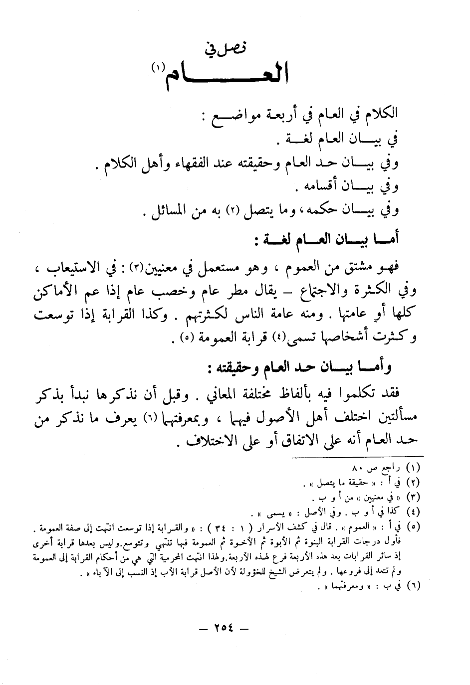 فهو مشتق من العموم، وهو مستعمل في معنيين (¬3): في الاستيعاب، وفي الكثرة والاجتماع - يقال مطر عام وخصب عام إذا عم الأماكن كلها أو عامتها. ومنه عامة الناس لكثرتهم. وكذا القرابة إذا توسعت وكثرت أشخاصها تسمى (¬4) قرابة العمومة (¬5).