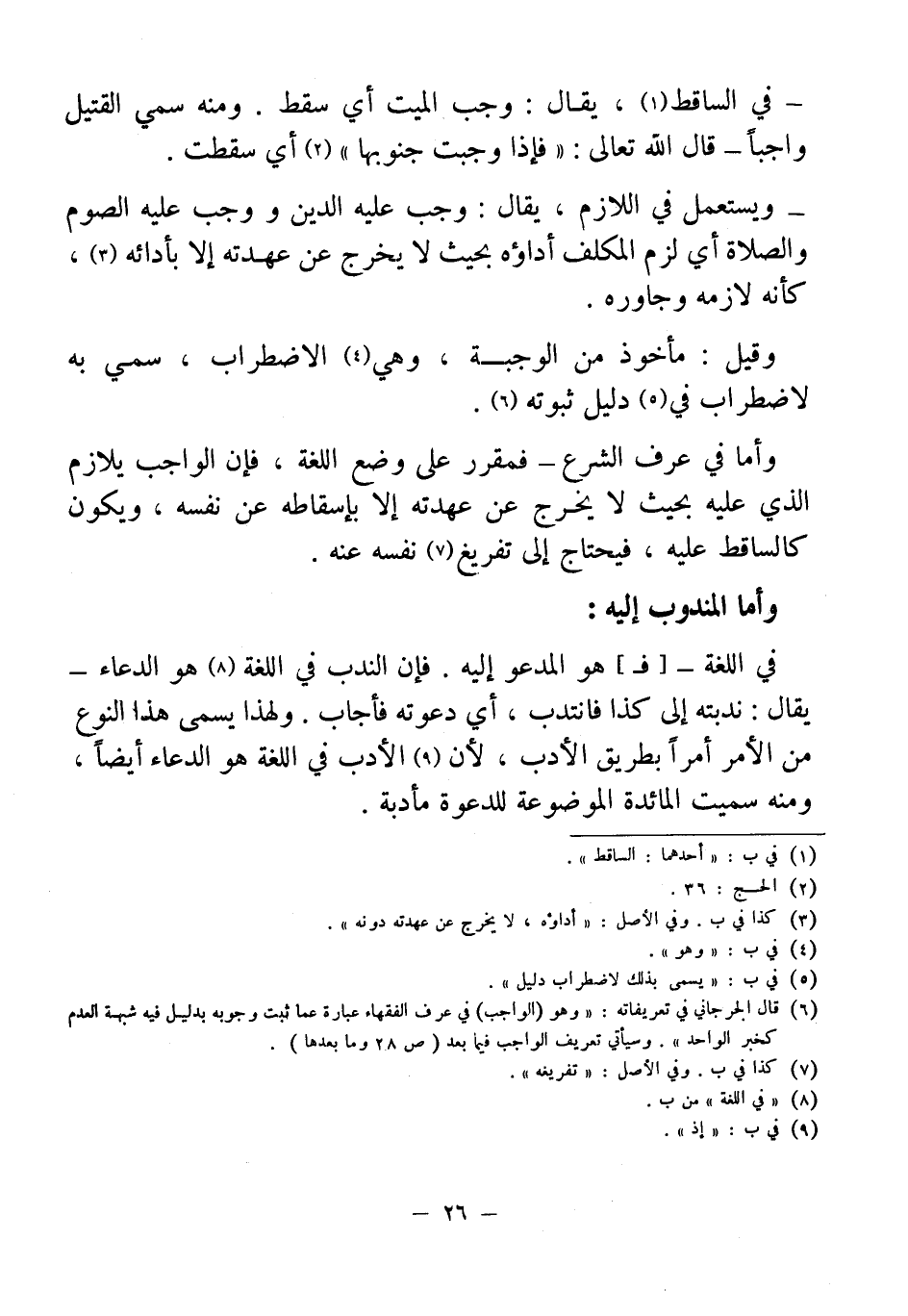 (¬6) قال الجرجاني في تعريفاته: " وهو (الواجب) في عرف الفقهاء عبارة عما ثبت وجوبه بدليل فيه شبهة العدم كخبر الواحد". وسيأتي تعريف الواجب فيما بعد (ص 28 وما بعدها).