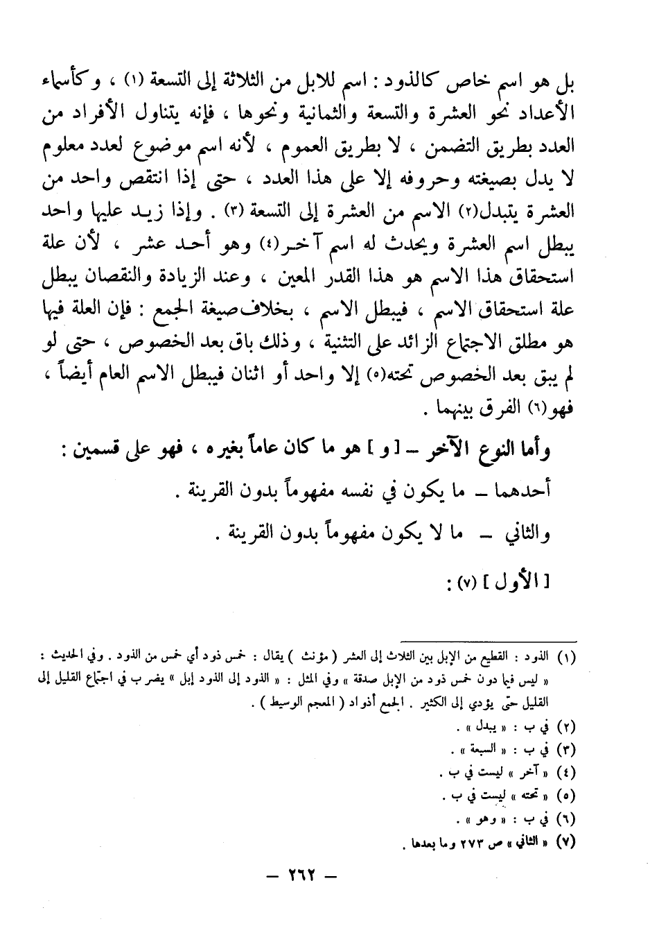 بل هو اسم خاص كالذود: اسم للابل من الثلاثة إلى التسعة (¬1)، وكأسماء الأعداد نحو العشرة والتسعة والثمانية ونحوها، فإنه يتناول الأفراد من العدد بطريق التضمن، لا بطريق العموم, لأنه اسم موضوع لعدد معلوم لا يدل بصيغته وحروفه إلا على هذا العدد، حتى إذا انتقص واحد من العشرة يتبدل (¬2) الاسم من العشرة إلى التسعة (¬3). وإذا زيد عليها واحد يبطل اسم العشرة ويحدث له اسم آخر (¬4) وهو أحد عشر, لأن علة استحقاق هذا الاسم هو هذا القدر المعين، وعند الزيادة والنقصان يبطل علة استحقاق الاسم، فيبطل الاسم، بخلاف صيغة الجمع: فإن العلة فيها هو مطلق الاجتماع الزائد على التثنية، وذلك باق بعد الخصوص، حتى لو لم يبق بعد الخصوص تحته (¬5) إلا واحد أو اثنان فيبطل الاسم العام أيضًا، فهو (¬6) الفرق بينهما.