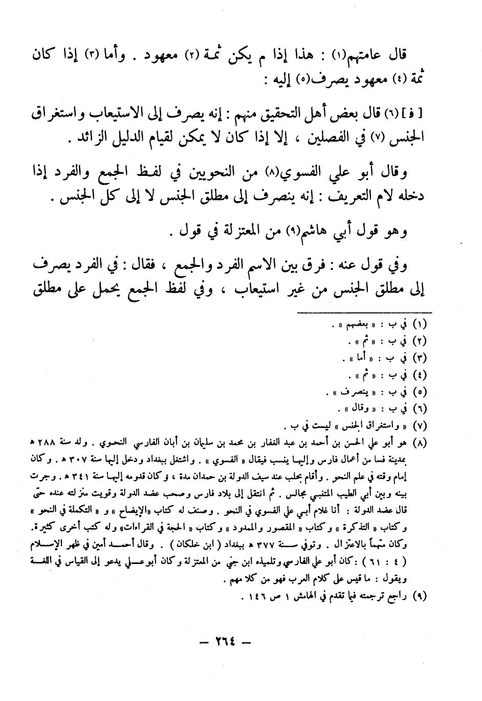 (¬8) هو أبو علي الحسن بن أحمد بن عبد الغفار بن محمد بن سليمان بن أبان الفارسي النحوي. ولد سنة 288 هـ بمدينة فسا من أعمال فارس وإليها ينسب فيقال "الفسوي". واشتغل ببغداد ودخل إليها سنة 307 هـ. وكان إمام وقته في علم النحو. وأقام بحلب عند سيف الدولة بن حمدان مدة، وكان قدومه إليها سنة 341 هـ. وجرت بينه وبين أبي الطيب المتنبي مجالس. ثم انتقل إلى بلاد فارس وصحب عضد الدولة وقويت منزلته عنده حتى قال عضد الدولة: أنا غلام أبي على الفسوي في النحو. وصحب له كتاب "الإيضاح" و"التكملة في النحو" وكتاب "التذكرة" وكتاب "المقصور والممدود" وكتاب "الحجة في القراءات" وله كتب أخرى كثيرة. وكان متهمًا بالاعتزال. وتوفي سنة 377 هـ ببغداد (ابن خلكان). وقال أحمد أمين في ظهر الإسلام (4: 61): كان أبو علي الفارسي وتليذه ابن جني من المعتزلة وكان أبو علي يدعو إلى القياس في اللغة ويقول: ما قيس على كلام العرب فهو من كلامهم.