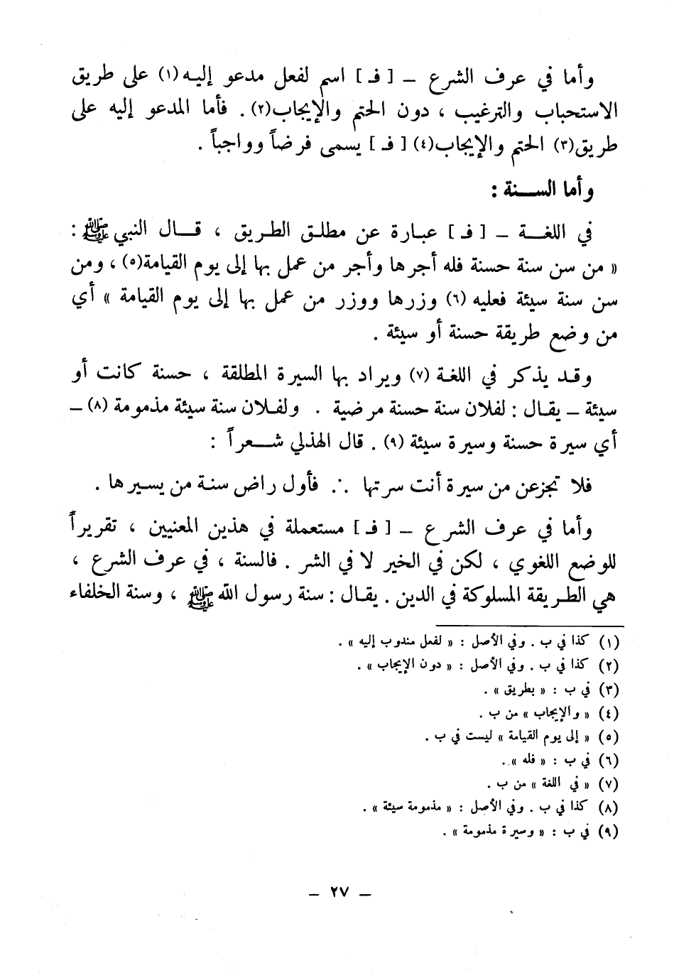 وقد يذكر في اللغة (¬7) ويراد بها السيرة المطلقة، حسنة كانت أو سيئة - يقال: لفلان سنة حسنة مرضية. ولفلان سنة سيئة مذمومة (¬8) - أي سيرة حسنة وسيرة سيئة (¬9). قال الهذلي شعراً: