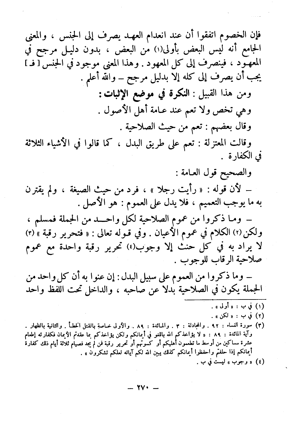 - وما ذكروا من عموم الصلاحية لكل واحد من الجملة فسلم، ولكن (¬2) الكلام في عموم الأعيان. وفي قوله تعالى: "فتحرير رقبة" (¬3) لا يراد به في كل حنث إلا وجوب (¬4) تحرير رقبة واحدة مع عموم صلاحية الرقاب للوجوب.