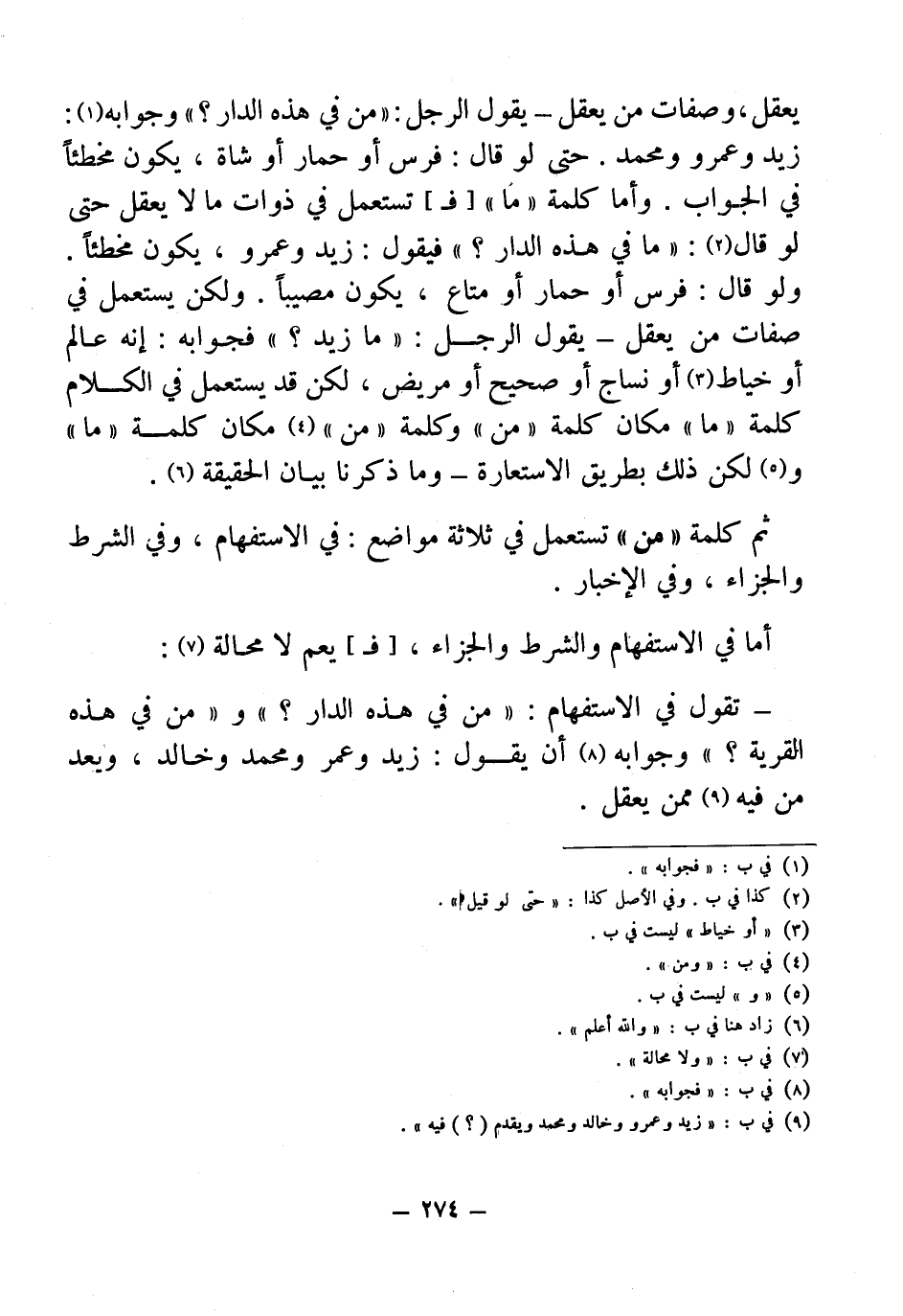 يعقل، وصفات من يعقل - يقول الرجل: "من في هذه الدار؟ " وجوابه (¬1): زيد وعمرو ومحمد. حتى لو قال: فرس أو حمار أو شاة، يكون مخطئًا في الجواب. وأما كلمة "ما" [فـ] تستعمل في ذوات ما لا يعقل حتى لو قال (¬2): "ما في هذه الدار؟ " فيقول: زيد وعمرو، يكون مخطئًا. ولو قال: فرس أو حمار أو متاع، يكون مصيبًا. ولكن يستعمل في صفات من يعقل - يقول الرجل: "ما زيد؟ " فجوابه: إنه عالم أو خياط (¬3) أو نساج أو صحيح أو مريض، لكن قد يستعمل في الكلام كلمة "ما" مكان كلمة "من" وكلمة "من" (¬4) مكان كلمة "ما" و (¬5) لكن ذلك بطريق الاستعارة - وما ذكرنا بيان الحقيقة (¬6).