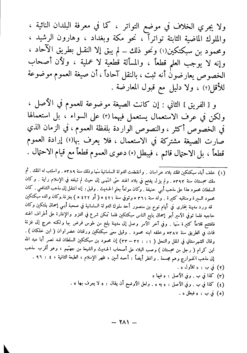 ولا يجري الخلاف في موضع التواتر، كما في معرفة البلدان النائية، والملوك الماضية الثابتة تواترًا، نحو مكة وبغداد، وهارون الرشيد، ومحمود بن سبكتكين (¬1) ونحو ذلك - لم يبق إلا النقل بطريق الآحاد، وإنه لا يوجب العلم قطعًا، والمسألة قطعية لا عملية، ولأن أصحاب الخصوص يعارضون أنه ثبت، بالنقل آحادًا، أن صيغة العموم موضوعة للأقل (¬2)، ولا دليل مع قبول المعارضة.
