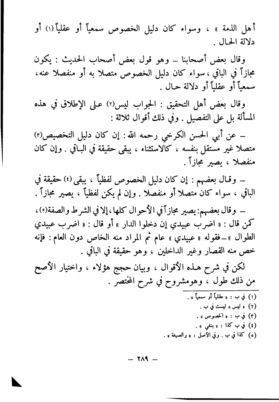 - وقال بعضهم: يصير مجازًا في الأحوال كلها، إلا في الشرط والصفة (¬5)، كمن قال: "اضرب عبيدي إن دخلوا الدار" أو قال: "اضرب عبيدي الطوال" - فقوله. "عبيدي" عام ثم المراد منه الخاص دون العام: فإنه خص منه القصار وغير الداخلين، وهو حقيقة في الباقي.