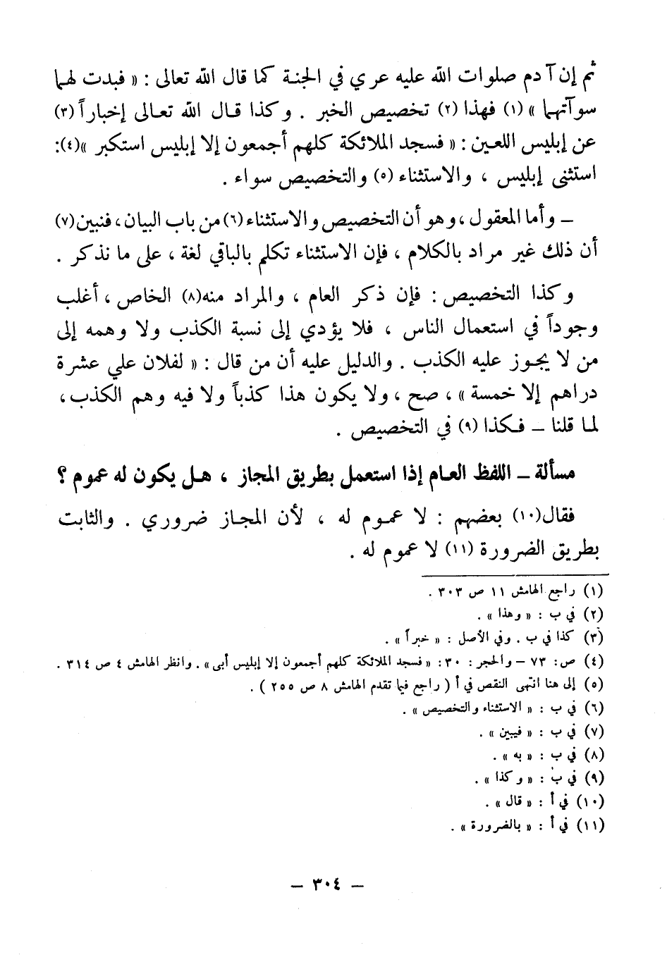ثم إن آدم صلوات الله عليه عري في الجنة كما قال الله تعالى: {فَبَدَتْ لَهُمَا سَوْآتُهُمَا} (¬1) فهذا (¬2) تخصيص الخبر. وكذا قال الله تعالى إخبارًا (¬3) عن إبليس اللعين: {فَسَجَدَ الْمَلَائِكَةُ كُلُّهُمْ أَجْمَعُونَ. إِلَّا إِبْلِيسَ اسْتَكْبَرَ} (¬4): استثنى إبليس، والاستثناء (¬5) والتخصيص سواء.