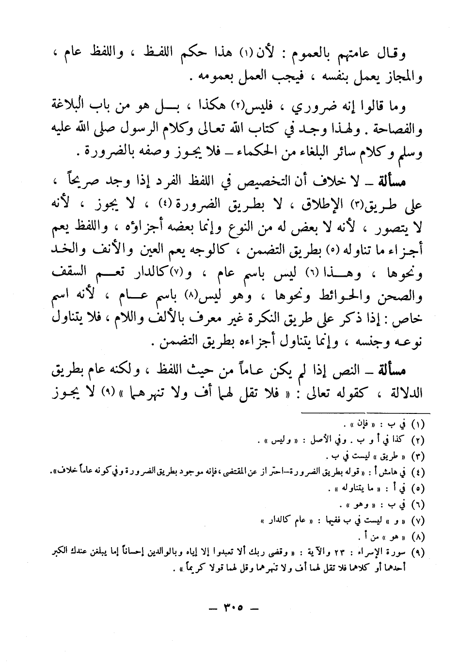مسألة - النص إذا لم يكن عامًا من حيث اللفظ، ولكنه عام بطريق الدلالة، كقوله تعالى: {فَلَا تَقُلْ لَهُمَا أُفٍّ وَلَا تَنْهَرْهُمَا} (¬9) لا يجوز