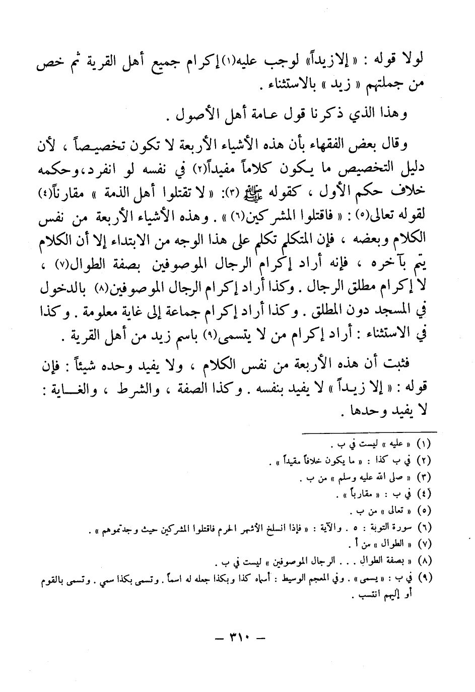 وقال بعض الفقهاء بأن هذه الأشياء الأربعة لا تكون تخصيصًا, لأن دليل التخصيص ما يكون كلامًا مفيدًا (¬2) في نفسه لو انفرد، وحكمه خلاف حكم الأول، كقوله - صلى الله عليه وسلم - (¬3): "لا تقتلوا أهل الذمة" مقارنًا (¬4) لقوله تعالى (¬5): {فَاقْتُلُوا الْمُشْرِكِينَ} (¬6). وهذه الأشياء الأربعة من نفس الكلام وبعضه، فإن المتكلم تكلم على هذا الوجه من الابتداء إلا أن الكلام يتم بآخره، فإنه أراد إكرام الرجال الموصوفين بصفة الطوال (¬7)، لا إكرام مطلق الرجال. وكذا أراد إكرام الرجال الموصوفين (¬8) بالدخول في المسجد دون المطلق. وكذا أراد إكرام جماعة إلى غاية معلومة. وكذا فيَ الاستثناء: أراد إكرام من لا يتسمى (¬9) باسم زيد من أهل القرية.