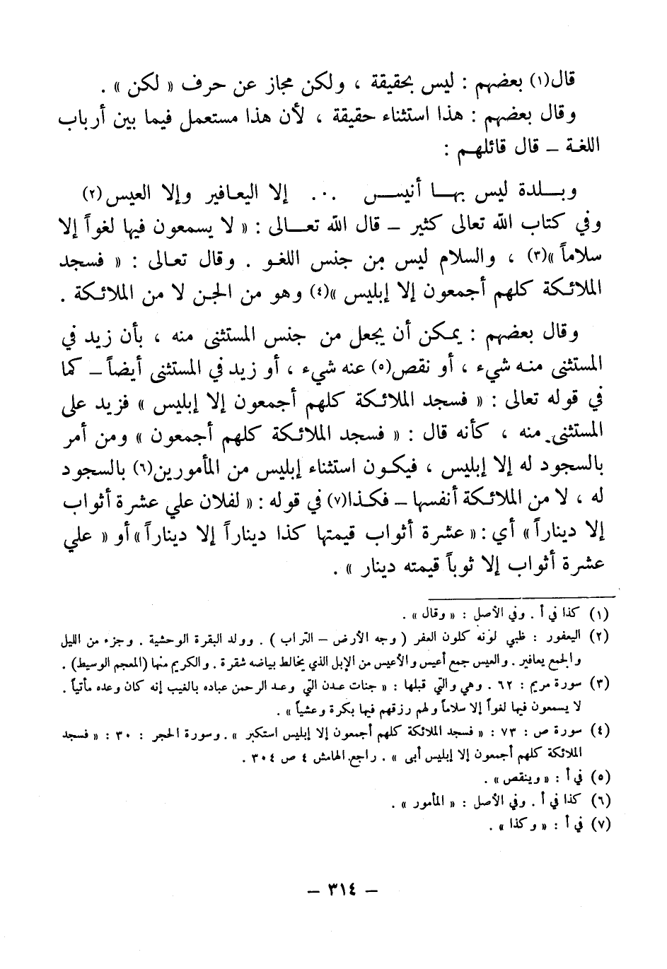 وفي كتاب الله تعالى كثير - قال الله تعالى: {لَا يَسْمَعُونَ فِيهَا لَغْوًا إِلَّا سَلَامًا} (¬3)، والسلام ليس من جنس اللغو. وقال تعالى: {فَسَجَدَ الْمَلَائِكَةُ كُلُّهُمْ أَجْمَعُونَ إِلَّا إِبْلِيسَ} (¬4) وهو من الجن لا من الملائكة.