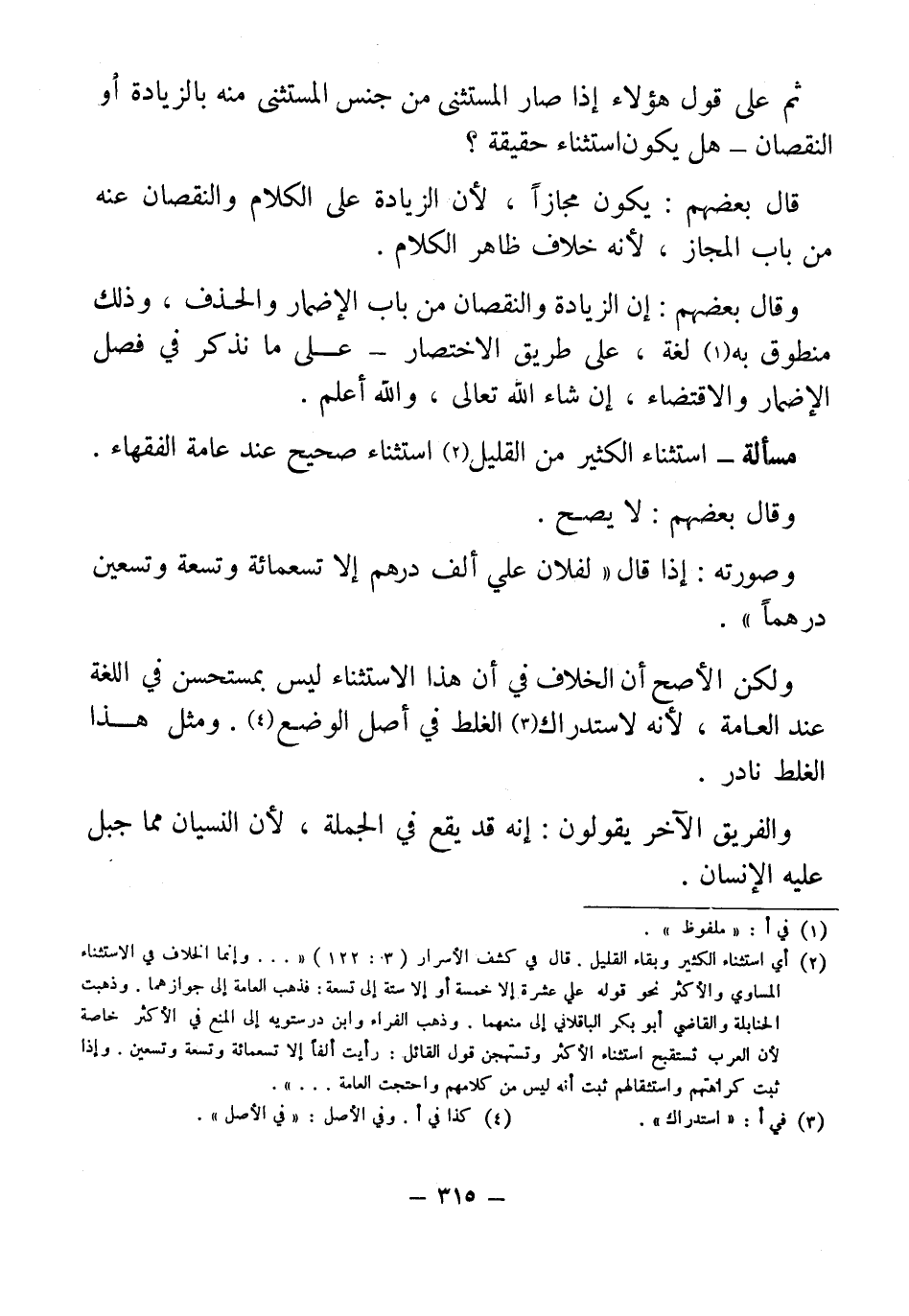 (¬2) أي استثناء الكثير وبقاء القليل. قال في كشف الأسرار (3.: 122) " ... وإنما الخلاف قوله الاستثناء المساوي والأكثر نحو قوله على عشرة إلا خمسة أو إلا شبية إلى تسعة: فذهب العامة إلى جوازهما. وذهبت الحنابلة والقاضي أبو بكر الباقلاني إلى منعهما. وذهب الفراء وابن درسويه إلى المنع في الأكثر خاصة لأن العرب ثستقبح استثناه الأكثر وتسهجن قول القائل: رأيت ألفاً إلا تسعمائة وتسعة وتسعين. وإذا ثبت كراهتهم واسثقالهم ثبت أنه ليس من كلامهم واحتجت العامة ... ".
